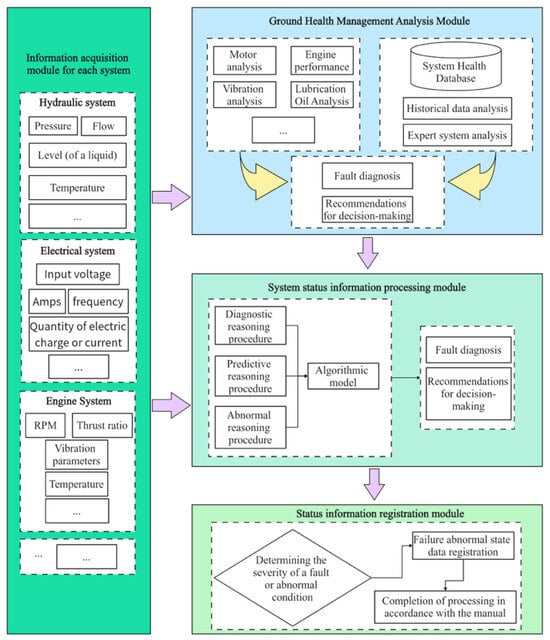 The engine system is highly integrated with the components closely linked, and the overall system state needs to be considered in the process of fault diagnosis. The PHM concept for aircraft and engine systems is shown in Figure 7. This figure presents an aircraft and engine system prediction and health management architecture that follows the layered PHM reference models such as ISO 13374 and OSA-CBM, in which condition monitoring systems are decomposed into data acquisition, processing, diagnostic/prognostic assessment, and advisory generation [70]. On the left, the information acquisition module deploys multi-source sensors on the hydraulic, electrical and engine systems to collect key condition parameters (pressure, flow, voltage, current, RPM, vibration, temperature, etc.), corresponding to the data acquisition layer in standard PHM frameworks [71]. The ground health management analysis module then performs dedicated analyses—motor and engine performance, vibration and oil analysis—combined with a system health database and historical/expert knowledge to form an initial assessment of system health, similar to the data manipulation and health assessment functions in established PHM architectures [72]. The system status information processing module integrates diagnostic, predictive and abnormal-condition reasoning within an algorithmic model, implementing state detection, fault diagnosis, and prognostic assessment as described in generic PHM reference models. Finally, the status information registration module evaluates fault severity and records abnormal states and completed maintenance actions, closing the loop between monitoring, decision support and maintenance execution, and enabling continuous improvement of the health management system and maintenance policies [73].