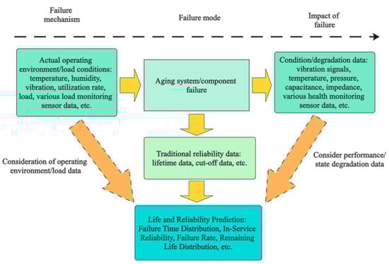 Remaining Useful Life prediction is one of the core technologies of Predictive Maintenance (PdM), which accurately predicts the health status and remaining life of key components through the real-time monitoring of equipment status and combining with historical operation data, so as to formulate scientific maintenance plans before failures occur. The life prediction in big data environment is shown in Figure 11 [56]. The core is to achieve the reliability management and life prediction of aviation equipment or systems through the fusion of multi-source data and dynamic analysis, and to build a closed loop of complete life cycle prediction.