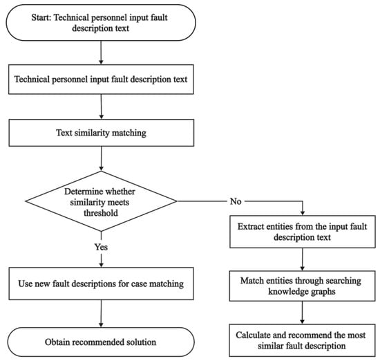 Once the fault text extraction is completed, the extracted fault entities can be used to construct a fault knowledge graph. By analyzing the relationships and node information in the knowledge graph, it is possible to determine the historical trajectory of the data, understand how the data were formed and evolved, and the origin of each data element. By analyzing the data lineage in the knowledge graph, one can identify possible risks and potential problems in the data processing process so that appropriate measures can be taken for repair. To solve the problem of a huge amount of fault data from aviation equipment and the inefficiency in traditional fault diagnosis methods, Chen et al. [126] used knowledge graph technology to build a high-performance graph database to replace the traditional relational database used in civil aircraft to improve the efficiency of fault diagnosis decision-making, and through a mechanism of attention, it was combined with BiGRU on the knowledge extraction model for improvement. Zhang et al. [127] constructed an aero-engine fault knowledge graph through a two-way neural network layer and a conditional random field, successfully extracted the fault entities, and used these entities to construct a knowledge graph of lubricant pressure faults, which realized intelligent repair of aero-engine faults. Xing et al. [128] designed a commercial aircraft maintenance solution recommendation system by combining the term frequency-inverse document frequency (TF-IDF) similarity algorithm with the Boyer–Moore (BM) LSTM algorithm. The system aims to achieve accurate matching of corresponding maintenance solutions through accurate retrieval of unstructured fault description text, and the flow of the commercial aircraft maintenance solution recommendation system is shown in Figure 13. Li et al. [129] used knowledge graph and SQLite database to construct a knowledge base for aircraft maintenance and repair, including routine maintenance, faulty maintenance, new maintenance, exception report, maintenance record knowledge, and search history knowledge. Nie et al. [130] proposed a knowledge graph construction and application technique for aircraft power system fault diagnosis by using a BMEO (Beginning, Middle, End, Outside) labelled entity extraction corpus to train a BiLSTM network to extract entities from unstructured text. On this basis, the annotated relationship extraction corpus is used and the BiLSTM is trained for relationship extraction between entities based on the attention mechanism. The extracted entities and relationships are finally used to construct a knowledge graph for aircraft power system fault diagnosis.