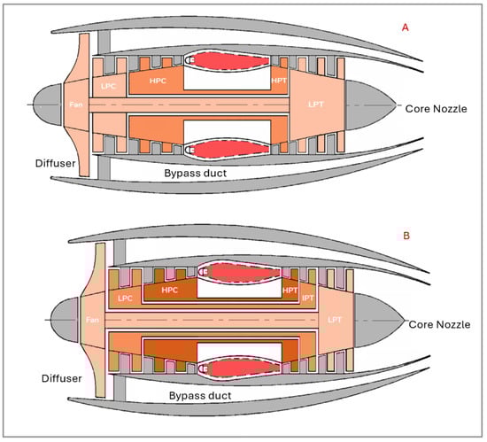 Figure 1. Principal Components and Spool Configurations of Turbofan Engines. (A) The twin-spool configuration. (B) The triple-spool configuration.