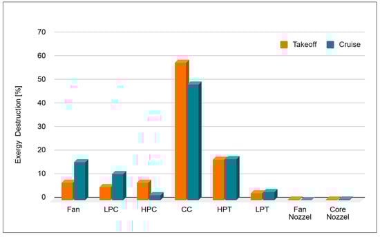 Figure 4. Exergy destruction percentage of each component in Case-4 at takeoff and cruise.