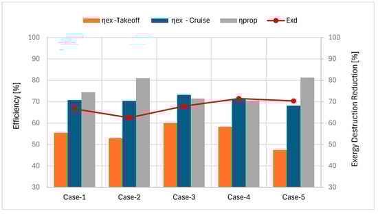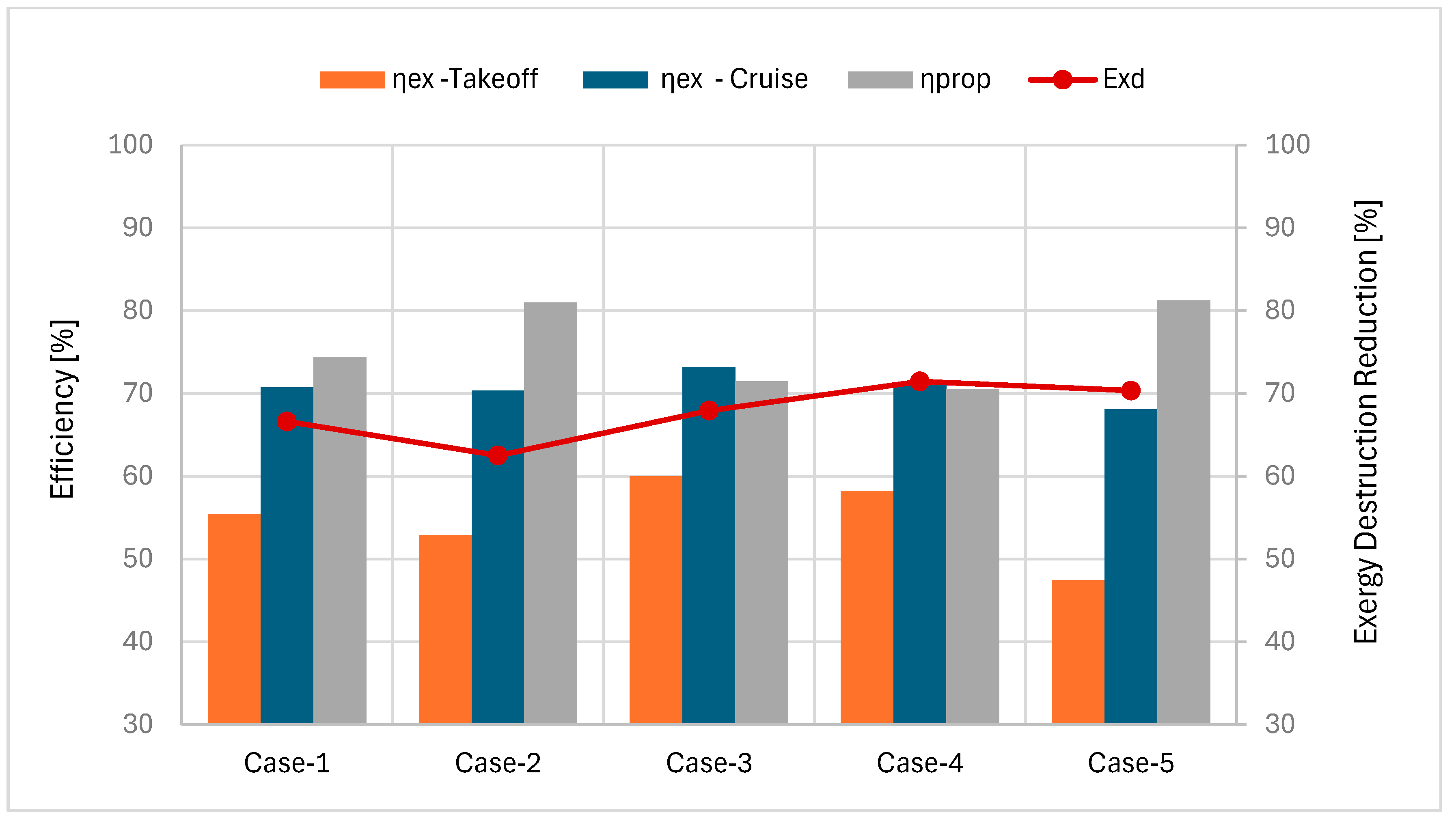 Figure 5. Exergetic efficiency, propulsive efficiency and exergy destruction reduction as a percentage across takeoff and cruise for all proposed turbofan engines.