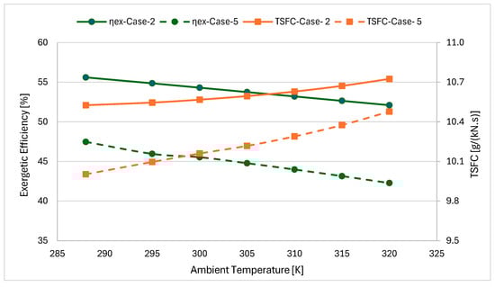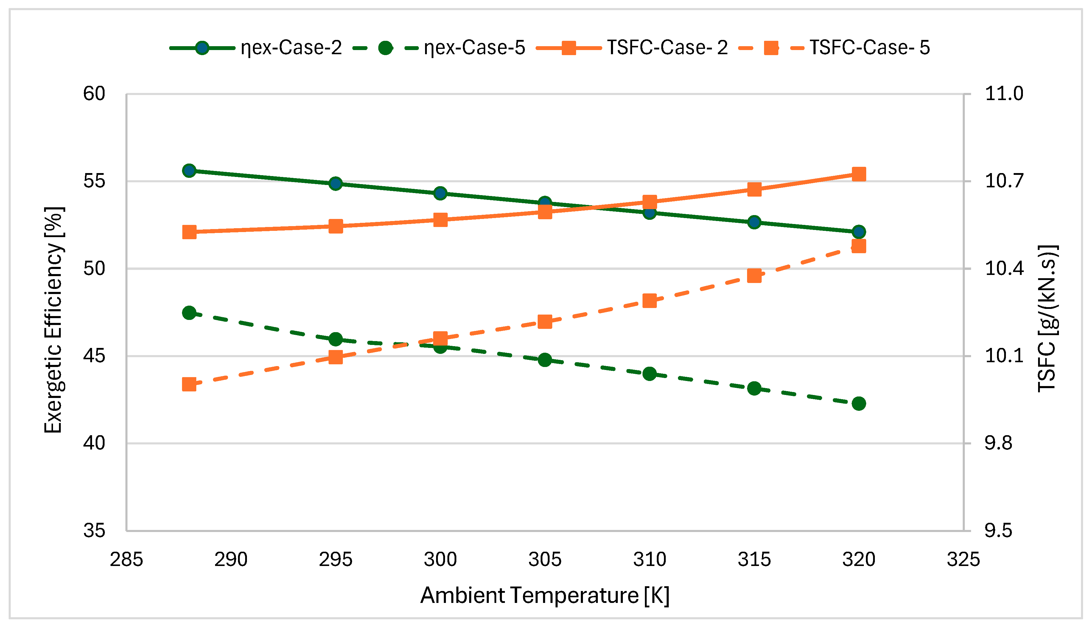 Figure 6. Exergetic efficiency and thrust specific fuel consumption (TSFC) versus ambient temperature at takeoff for Case-2 and Case-5.