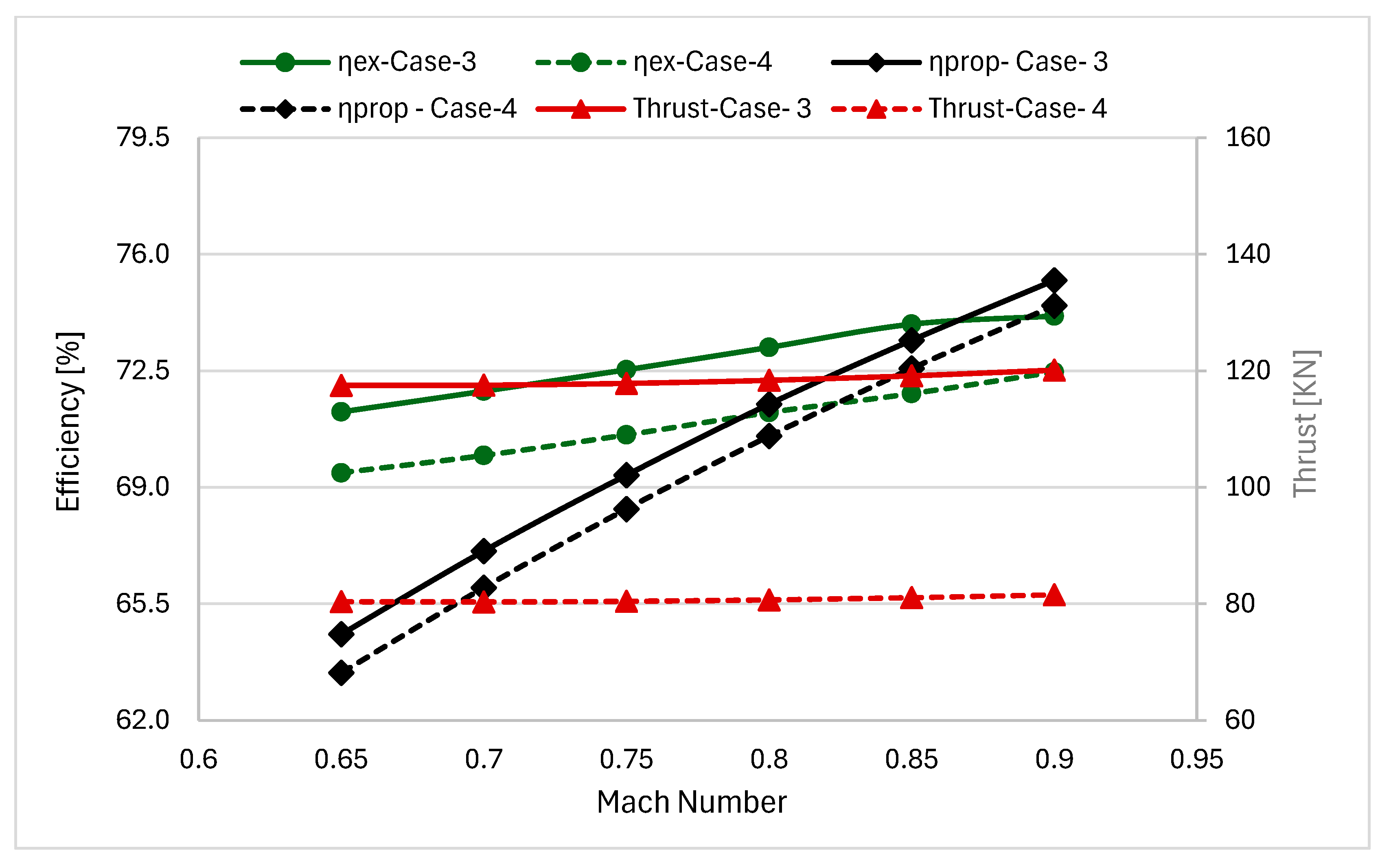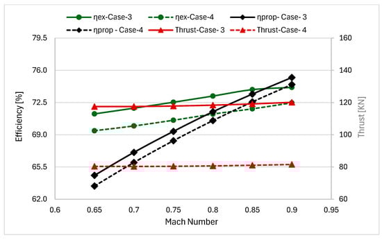 Figure 8. Exergetic efficiency, propulsive efficiency, and thrust versus Mach number at cruise for Case-3 and Case-4.
