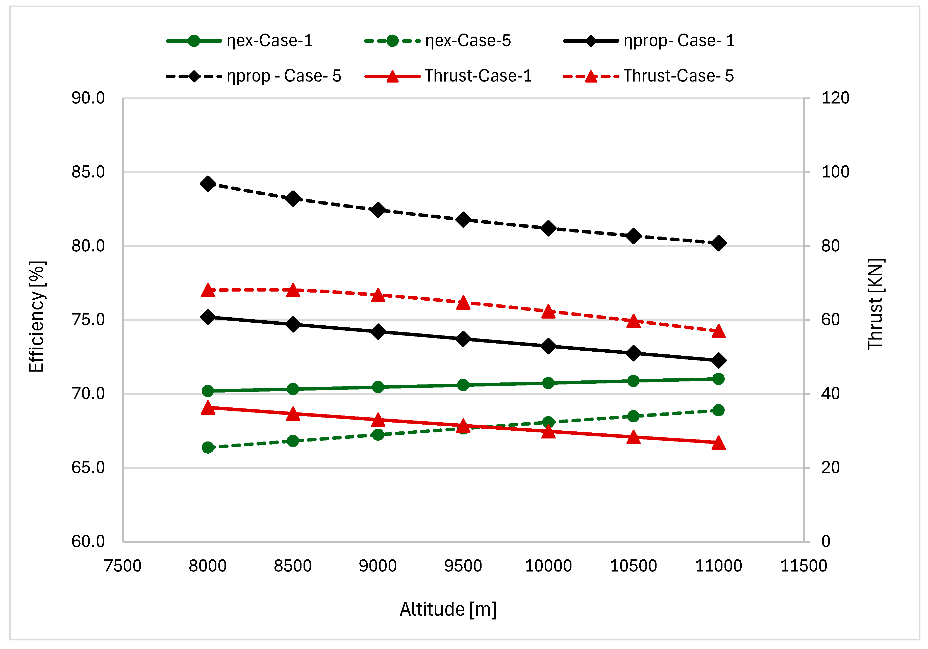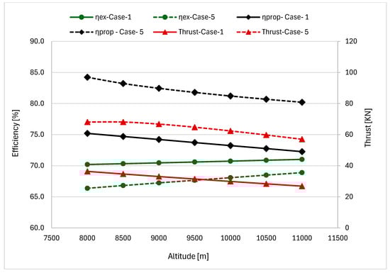 Figure 9. Exergetic efficiency, propulsive efficiency, and thrust versus altitude at cruise for Case-1 and Case-5.
