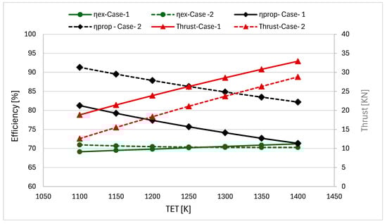 Figure 10. Exergetic efficiency, propulsive efficiency, and thrust versus turbine entry temperature (TET) at cruise for Case-1 and Case-2.