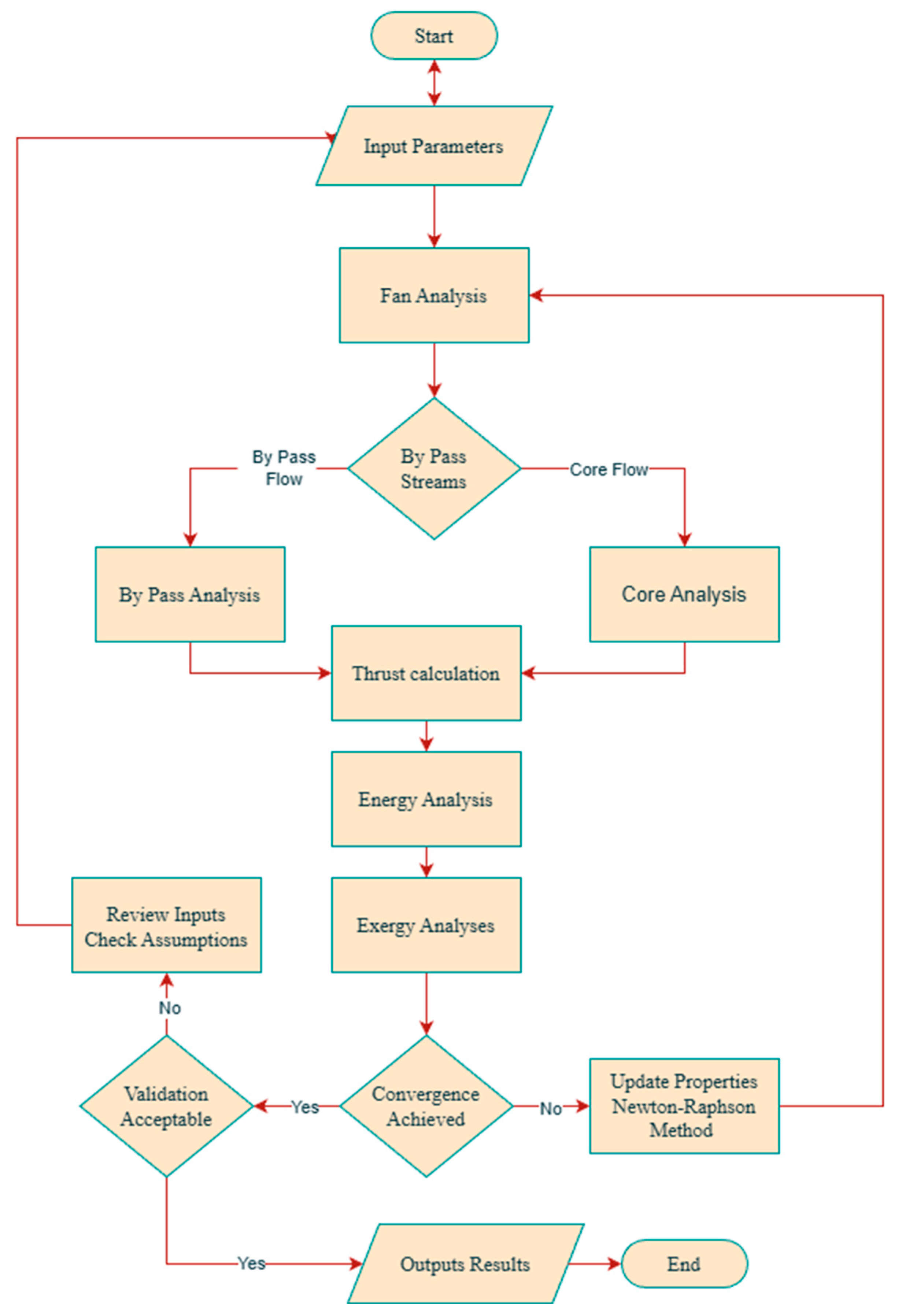 Figure 2. Flowchart of the computational methodology for turbofan engine performance and exergy analysis under various operating conditions.
