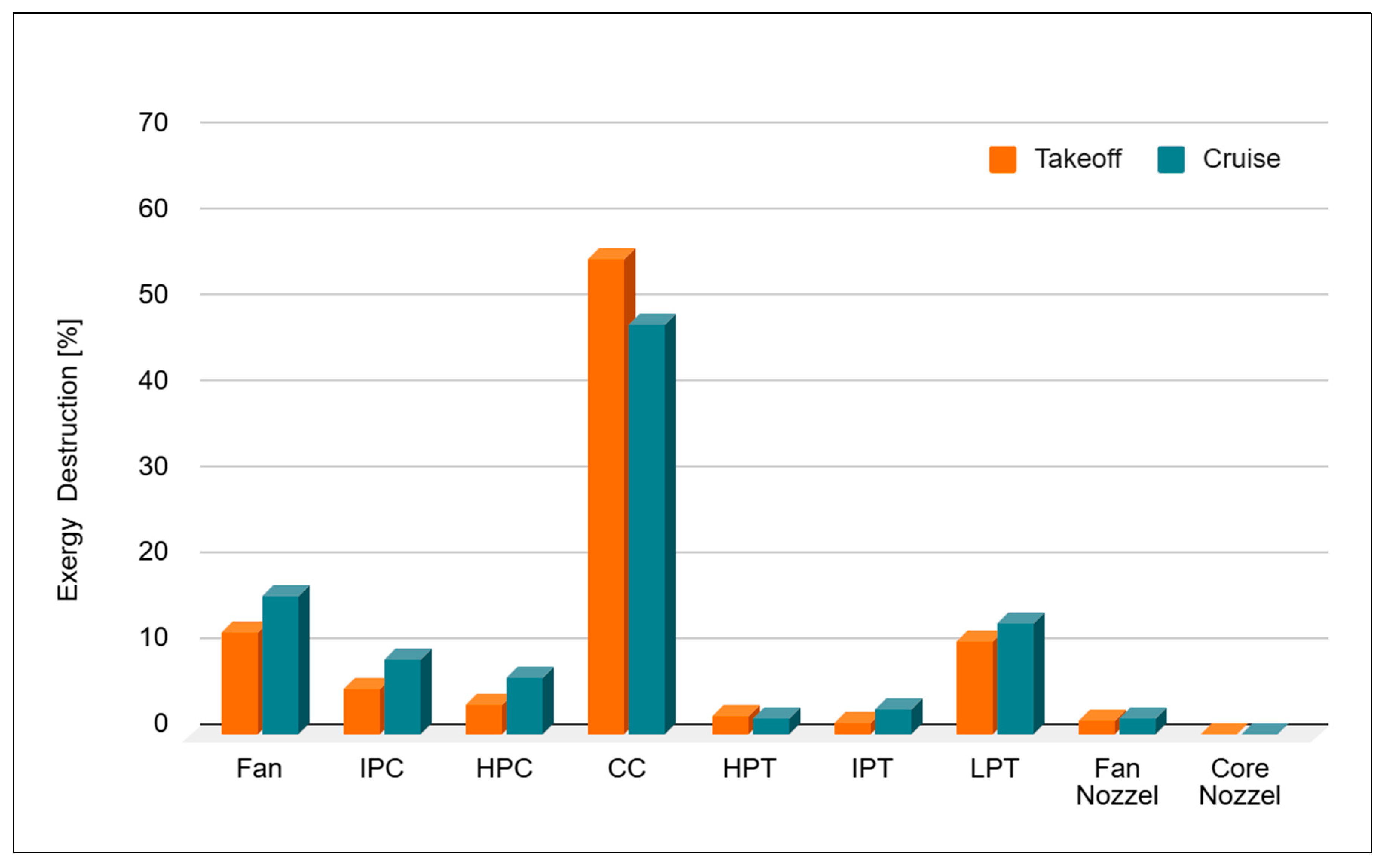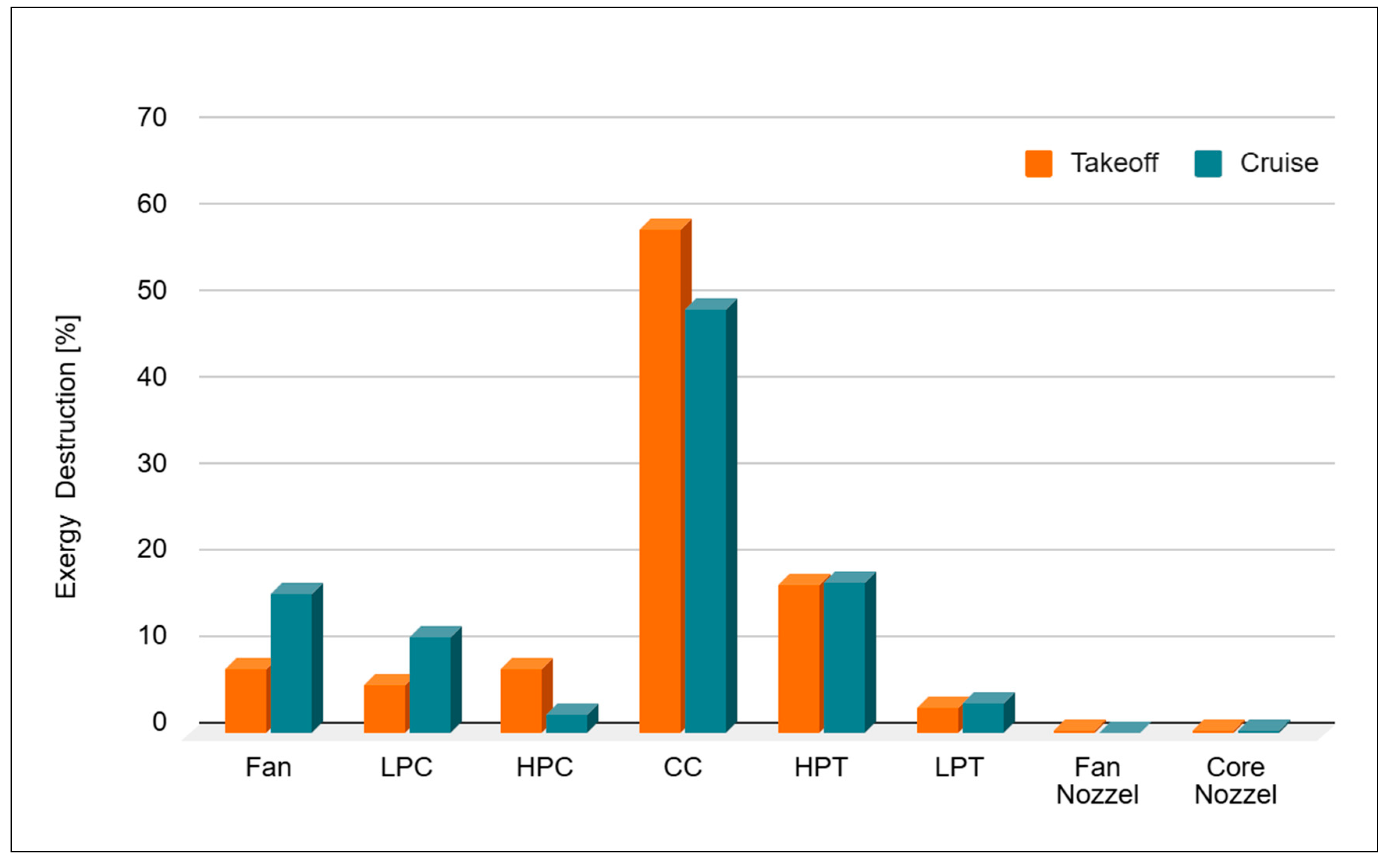 Figure 3. Exergy destruction percentage of each component in Case-1 at takeoff and cruise.