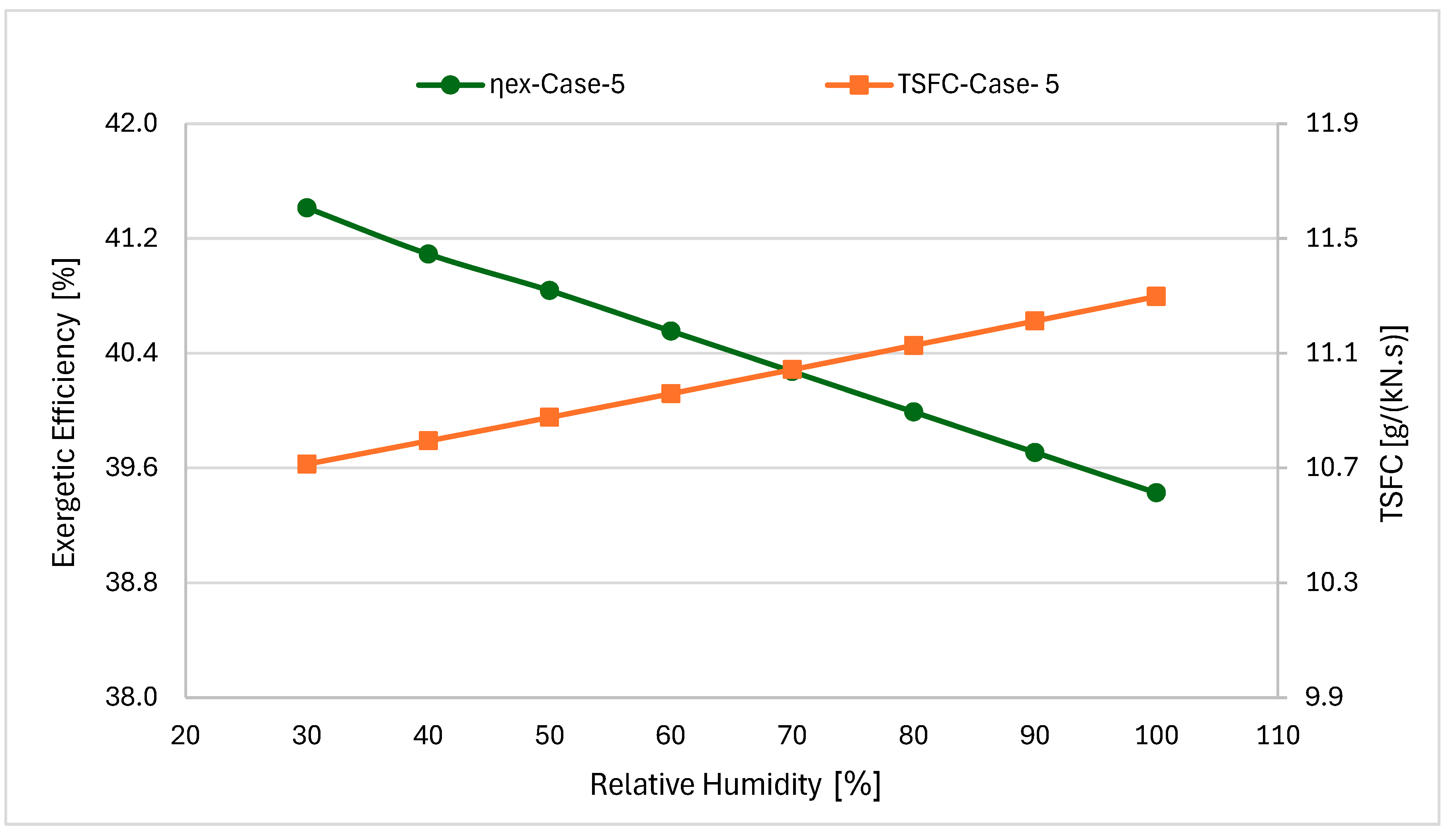 Figure 7. Exergetic efficiency and thrust specific fuel consumption (TSFC) versus relative humidity at takeoff for Case-5.