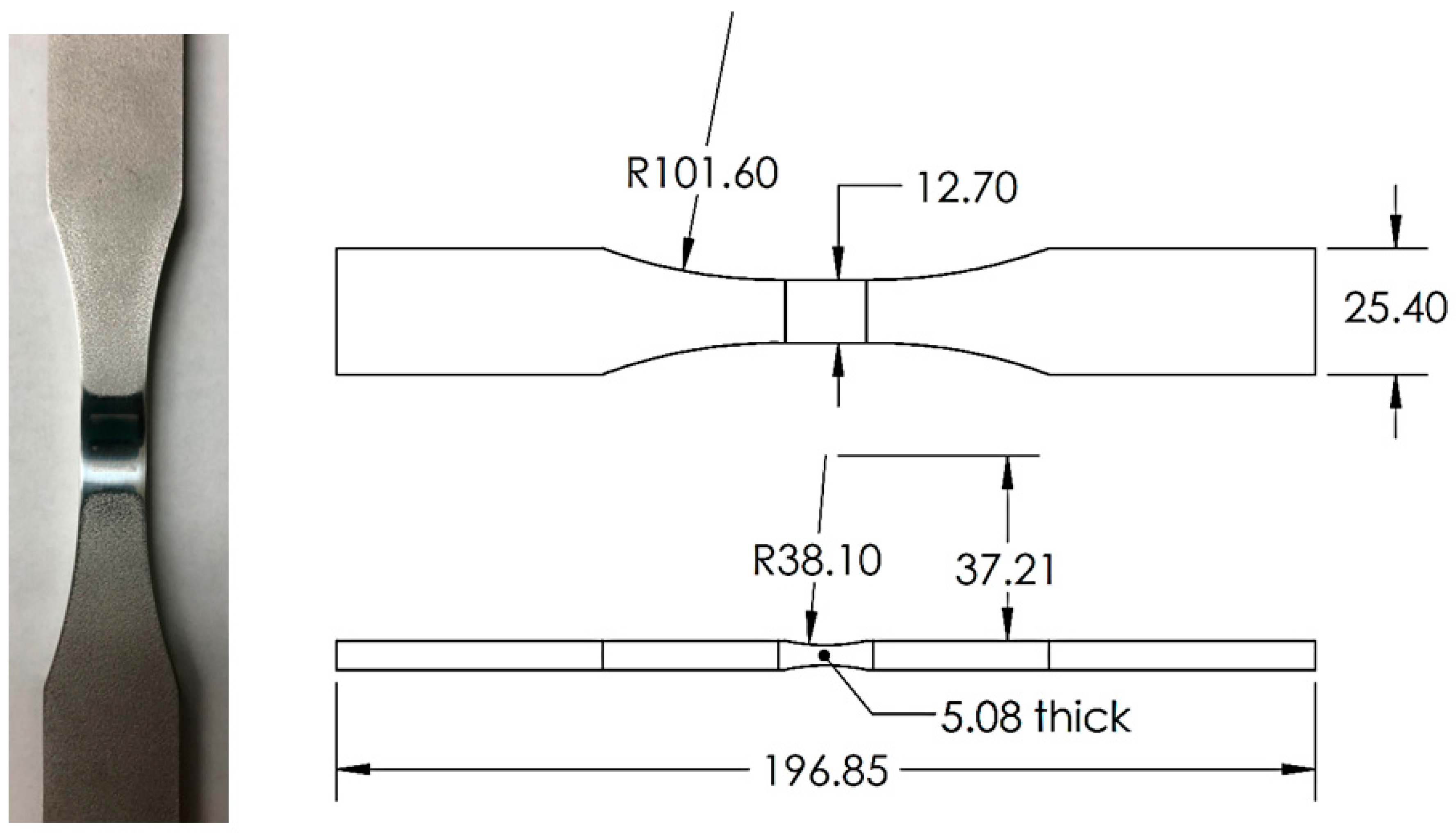 The specimen geometry (Figure 1) is a flat bar cut from a 6.35 mm plate. Shallow notches (radius 38.1 mm, depth 0.635 mm) were fabricated on both sides of the specimen using wire electrical discharge machining (EDM) to promote the initiation location of surface cracks and to confine the replication compound for crack observation. The specimen geometry is within the recommended ranges provided by ASTM E466 [39] and E647 [40], and a similar specimen geometry was successfully used with surface replications to observe naturally initiating surface fatigue cracks in a prior study [41]. Specimens were polished along the gauge section and edges by sequential wet sanding with 400, 600, 800, 1000, 2000, and 3000 grit sandpaper to a near mirror finish to aid in surface replica measurement before testing. Specimens were loaded in tension in the L-T direction.