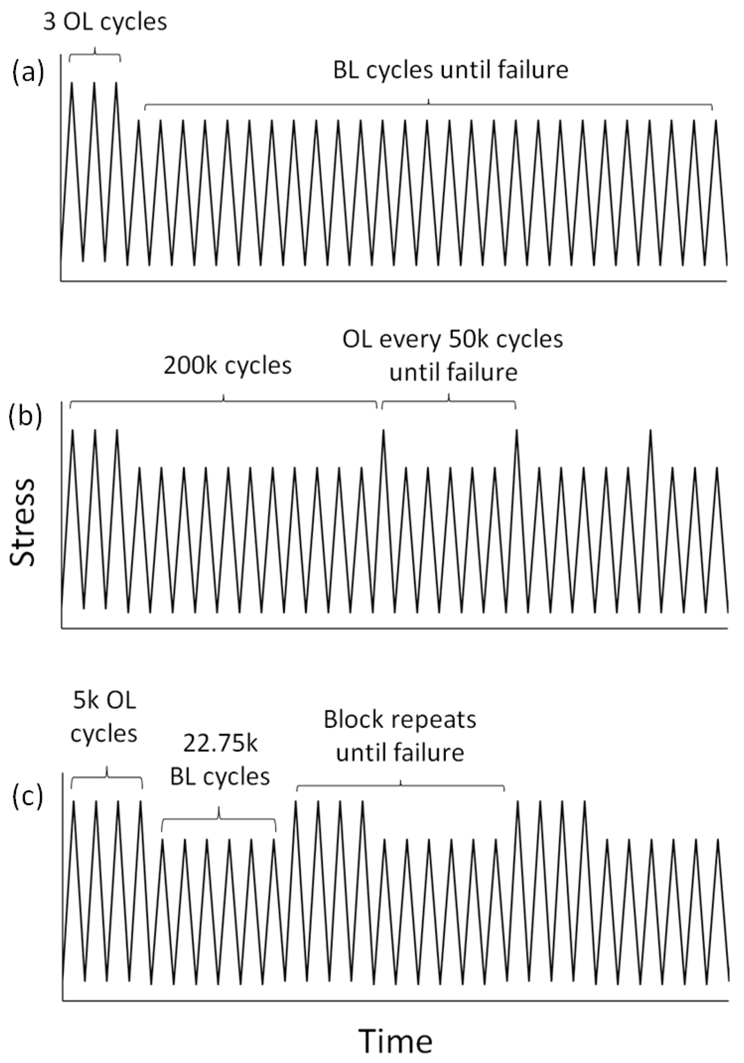 The VAF loading cases were selected for a focused investigation of two scenarios: (1) a single periodic overload (POL) and (2) a sustained OL with both low and high cycles designed to contribute equally to damage accumulation (block loading) when assessed with a linear damage accumulation (LDR) method [42,43]. High and low applied stress levels were constant across all loading conditions for direct comparison of results. An additional VAF case, high-low (H-L) loading, was performed to observe the initial effects of plasticity on the material behavior. The H-L loading case consisted of three OL cycles at 724 MPa followed by 586 MPa cycles until failure. Thus, CL, CH, and H-L loadings were designed to provide comparison data for the more complex POL and block loading patterns.
