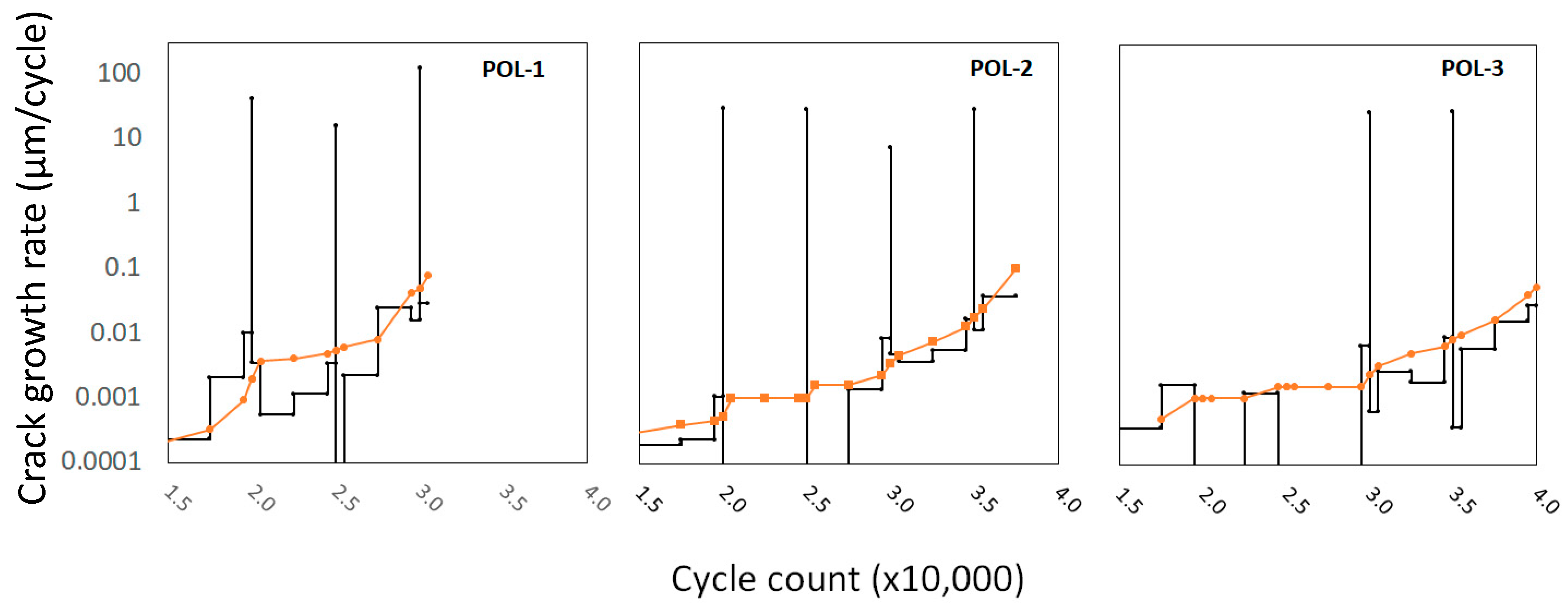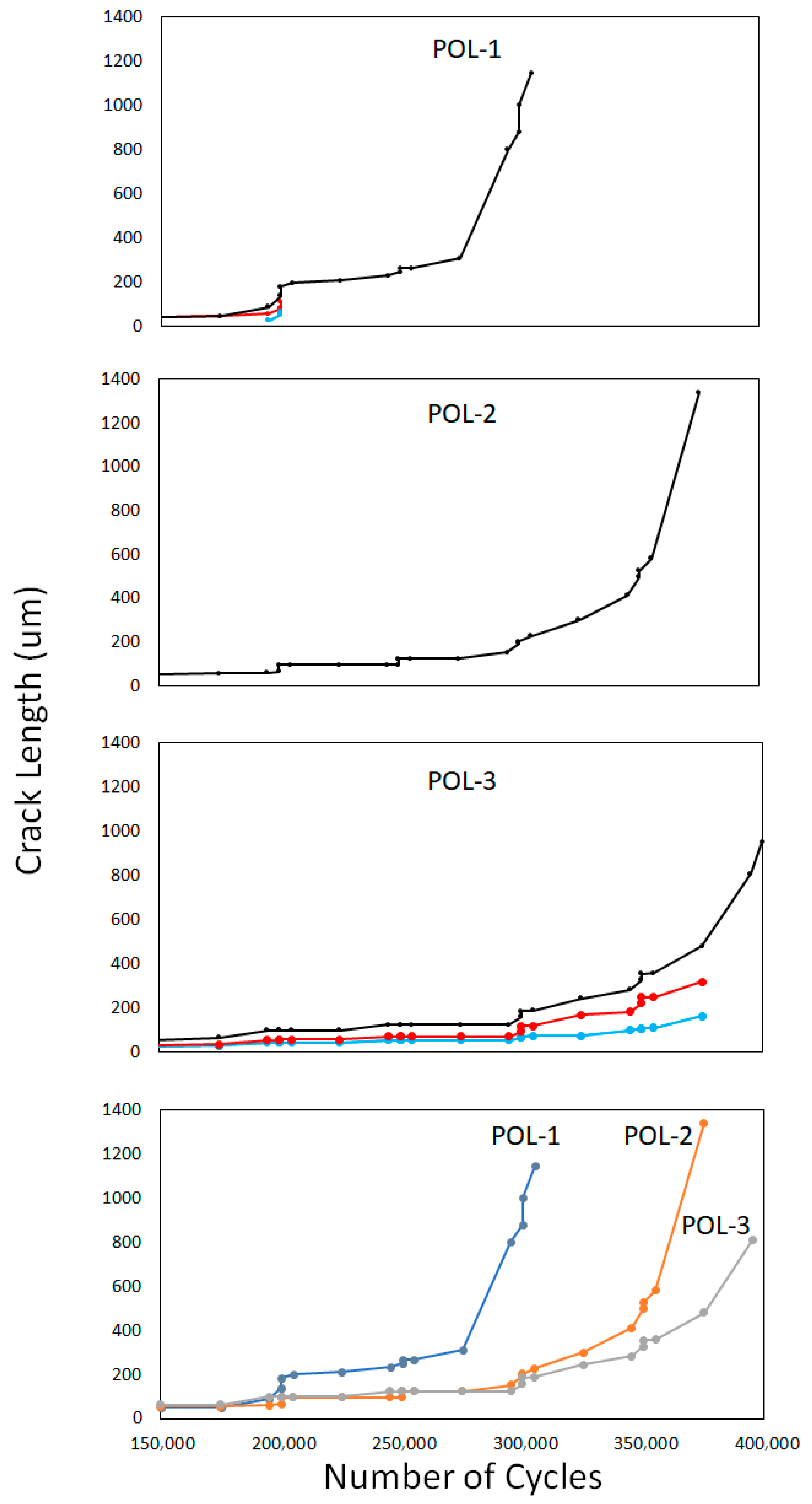Surface replicas were used to measure surface crack length at various cycle counts during the POL tests to observe crack growth behavior before and after tensile Ols. The total surface crack length of each specimen’s primary crack as a function of cycle count is shown in Figure 4. Surface crack behavior exhibited tortuous crack paths and microcrack coalescence, consistent with prior observations [41,45]. One specimen, POL-2, failed due to a single dominant crack that propagated in the gauge section, while the other two specimens, POL-1 and POL-3, failed due to the coalescence of several smaller cracks. While the crack recorded via surface replications on the POL-3 specimen occurred on the front face of the specimen, the dominant crack that led to failure initiated at the specimen edge within the gauge section. This crack was not fully measured as it was outside the notched region where surface replications were performed.