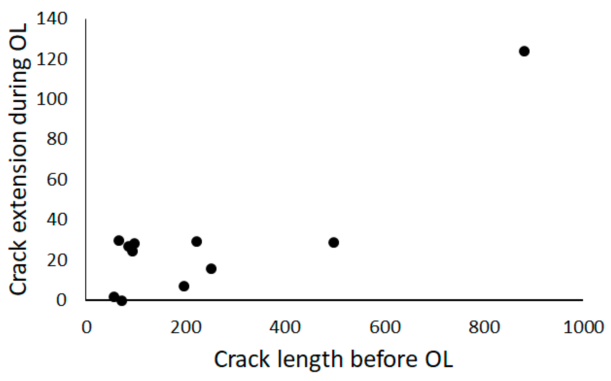 The extension experienced during the applied Ols is shown in Figure 5. The crack extension due to a single OL cycle does not appear to be correlated to the crack length at the time of the OL, but rather stays consistently under 35 µm, roughly corresponding to the characteristic microstructural dimension. An outlier in the length of crack extension is seen for the OL applied to the longest crack length of 900 µm, with crack extension of over 125 µm during the OL. This longer extension length is likely due to the crack approaching failure at the time of the OL, causing unstable crack growth. OL extension was previously observed in a nickel-based alloy [18,33] and other materials as previously discussed.