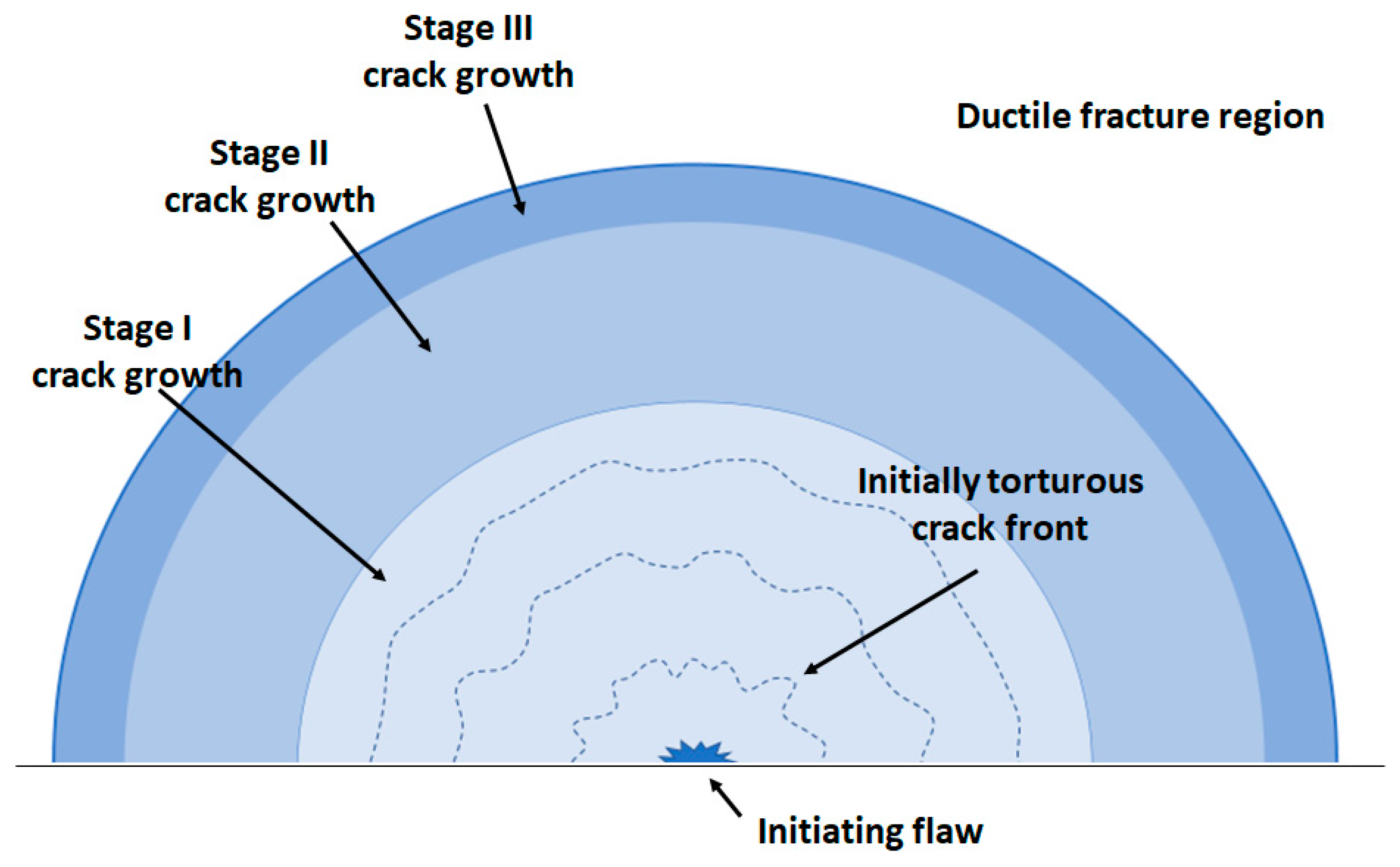 Overall, HCF and very high cycle fatigue (VHCF) are characterized by a large number of cycles to failure, e.g., 104 to 107, and negligible plastic to elastic strain and energy ratios. Beyond the initial nucleation phase and short crack growth regimes, HCF and VHCF are often modeled by the linear elastic fracture mechanics (LEFM) theory and are stress-based. In contrast, LCF and VLCF often refer to cycle-to-failure counts of about 100 to 1000 and 1 to 20, respectively [1]. The plastic deformation is significant in terms of both plastic strain and energy ratios to their elastic counterparts. Often, strain-based and plastic fracture mechanics (PFM) approaches are used in this regime. In general, the fatigue response of ductile metals is strongly dependent on the stress/strain state, especially for the LCF. For example, Kanvinde (2007) and Wei (2025) discuss mechanisms such as micro-void growth and micro-shear cracking under high triaxiality and shear-dominant loadings, respectively, for VLCF [2,3]. From a modeling perspective, there have been efforts to include such microstructural effects in the fatigue crack growth equations. For example, Zhou (2025) integrates a crystal plasticity (CP) finite element model with fatigue indicator parameters (FIPs) in a two-stage approach to account for microstructure-sensitive fatigue processes such as crack nucleation and microstructurally short crack growth [4]. Recently, machine learning approaches are also used to determine the most important microstructural features and loading parameters that contribute to different stages of fatigue crack growth [5].