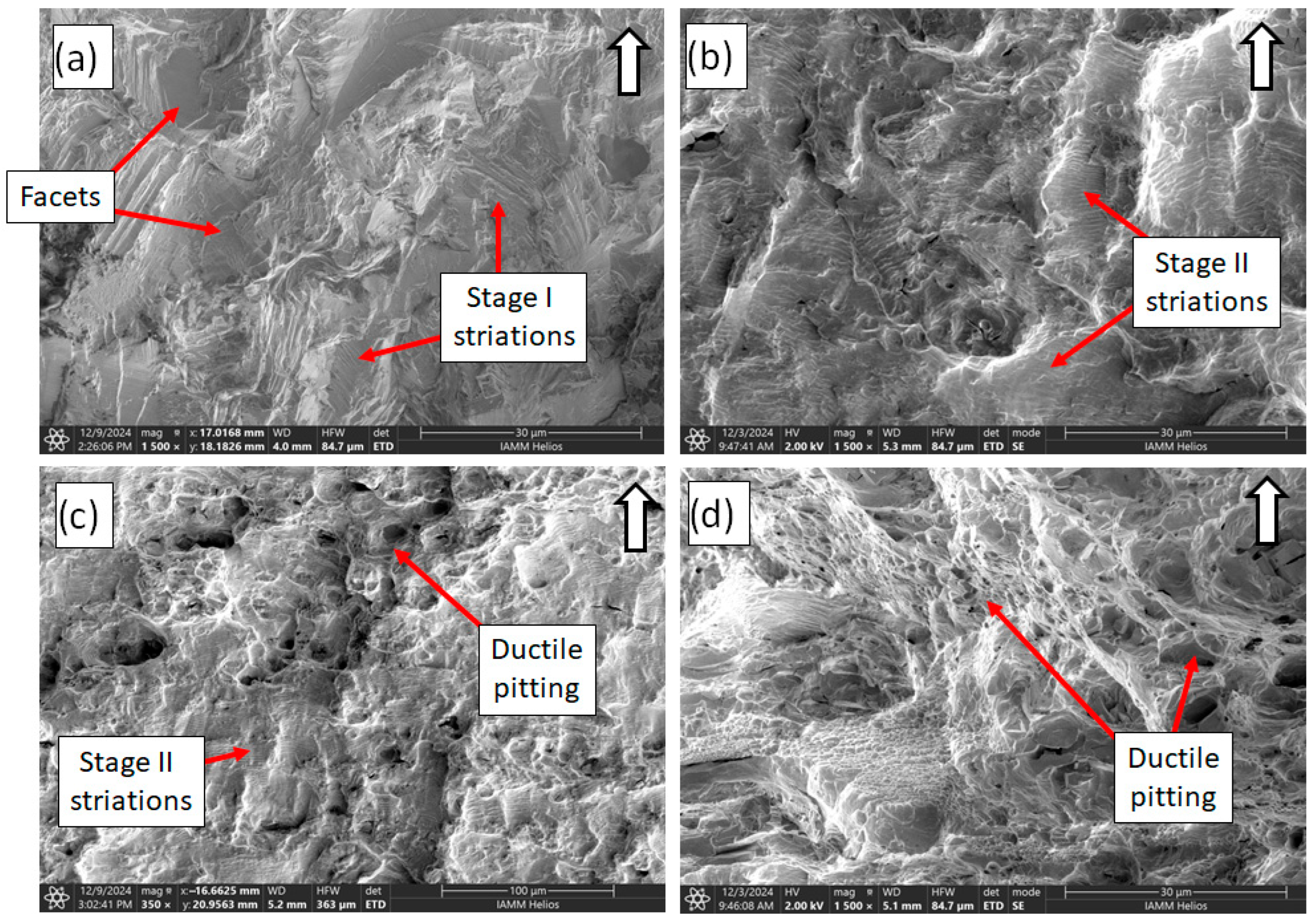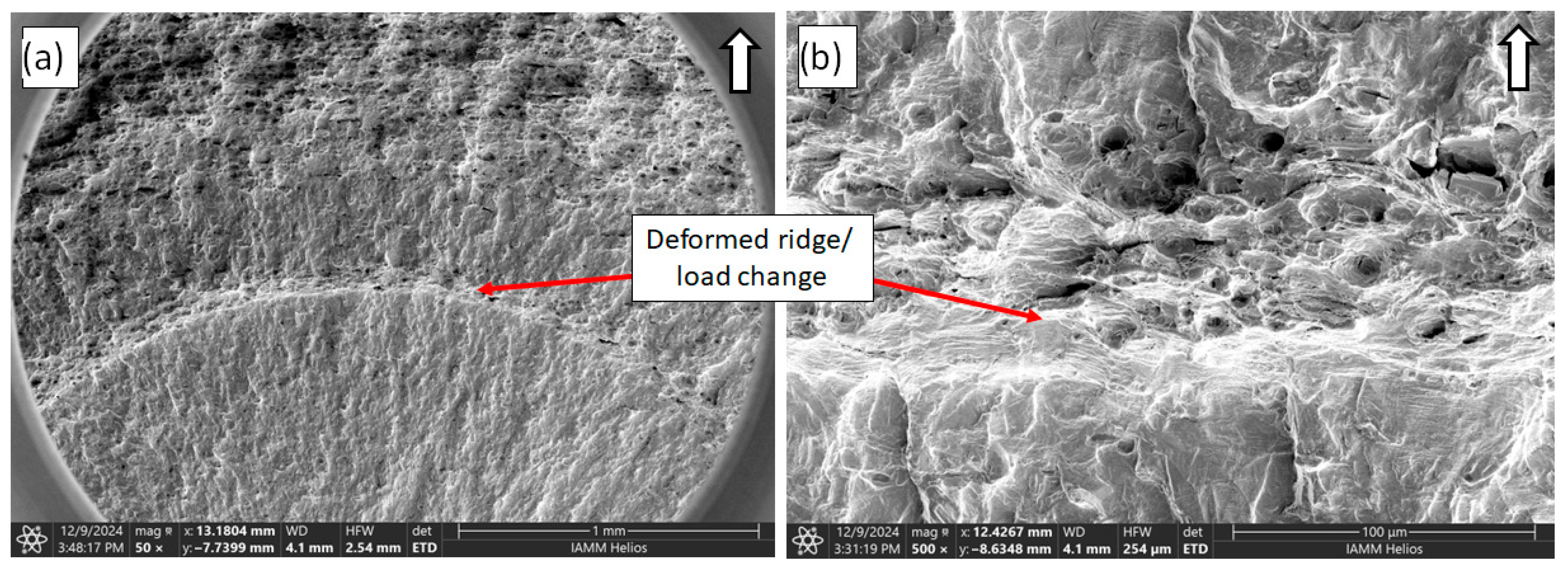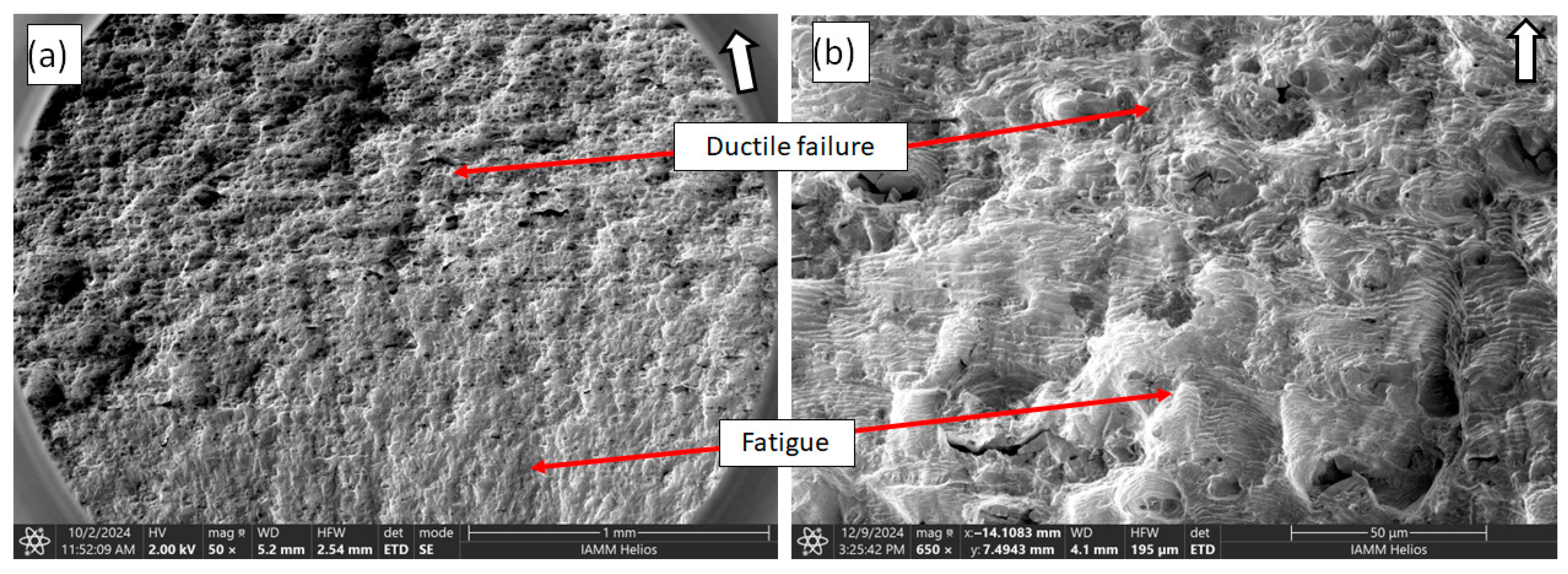 While the transition between fatigue and ductile fracture can be identified with a naked eye and at low magnifications on the fracture surface, finding the exact point of transition using high-resolution imaging is more challenging. In theory, stage II fatigue should be easily identifiable with fatigue striations and fast fracture with its ductile pitting texture. However, for this material, the fatigue surface exhibited elements of particle separation similar to pitting, and slip lines were visible in the ductile fracture region [46], thus confounding the exact point of transition. Examples of the transition between stage II fatigue and ductile fracture are shown in Figure 10, at both low and high magnifications. In general, the ratio between ductile damage and fatigue damage can be deduced by inspecting ductile damage-induced regions from the SEM images. While this ratio was not calculated for the present study, we refer the reader to [3] for further discussion on fatigue and ductile damage, as well as the sensitivity of ductile damage to loading paths or histories.