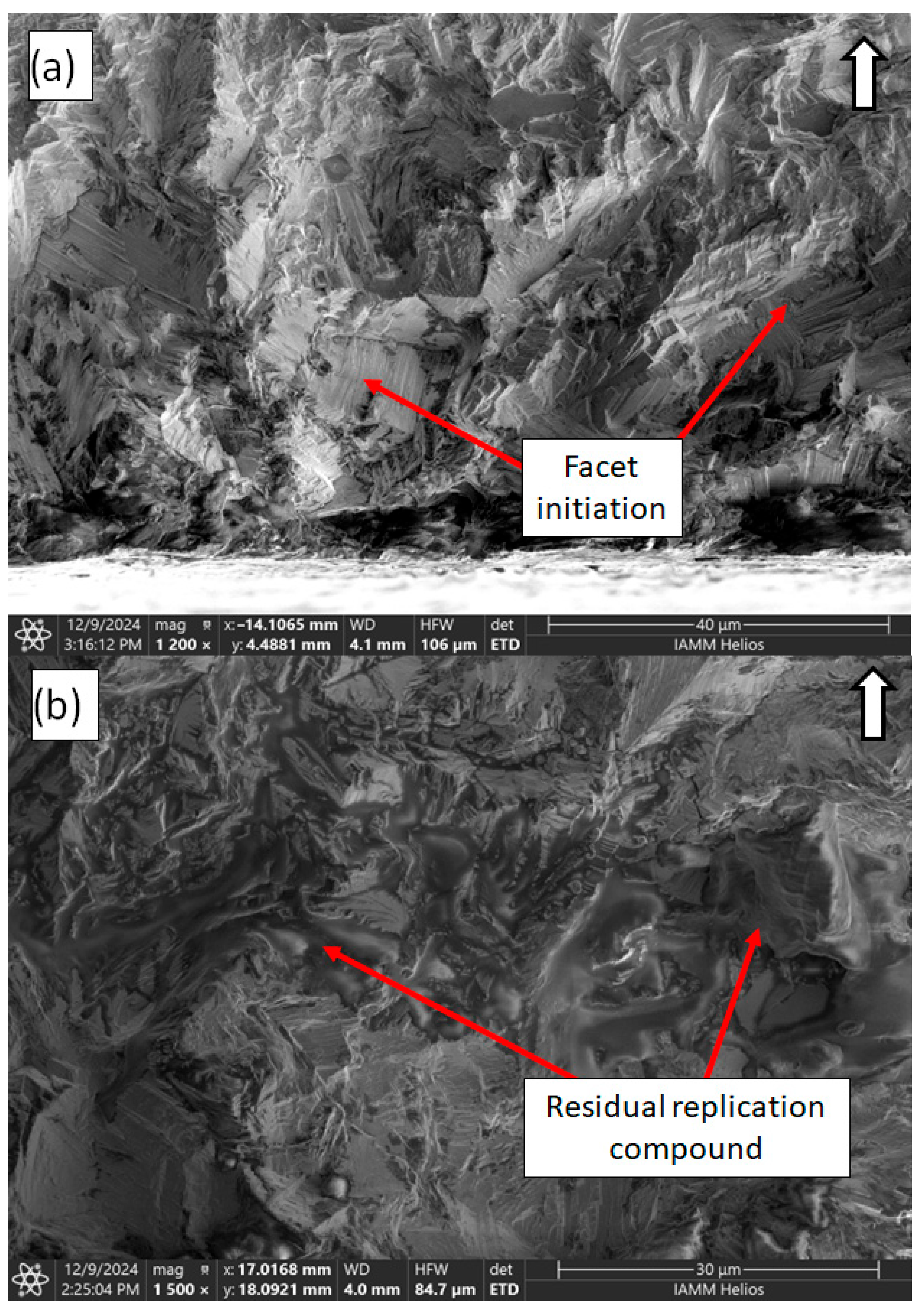 Fatigue cracks appeared to initiate via cleavage, with a rough, faceted texture similar to that seen in single-slip fatigue crack propagation. Crack initiation points were located using the origin point of beach/clam shell marks on the fatigue surface. Occasionally, for specimens with surface replications, the initiation point was occluded by remnants of the surface replication compound, which could be removed via the ultrasonic cleaning in solvent before imaging. These initiation characteristics are shown in Figure 8.