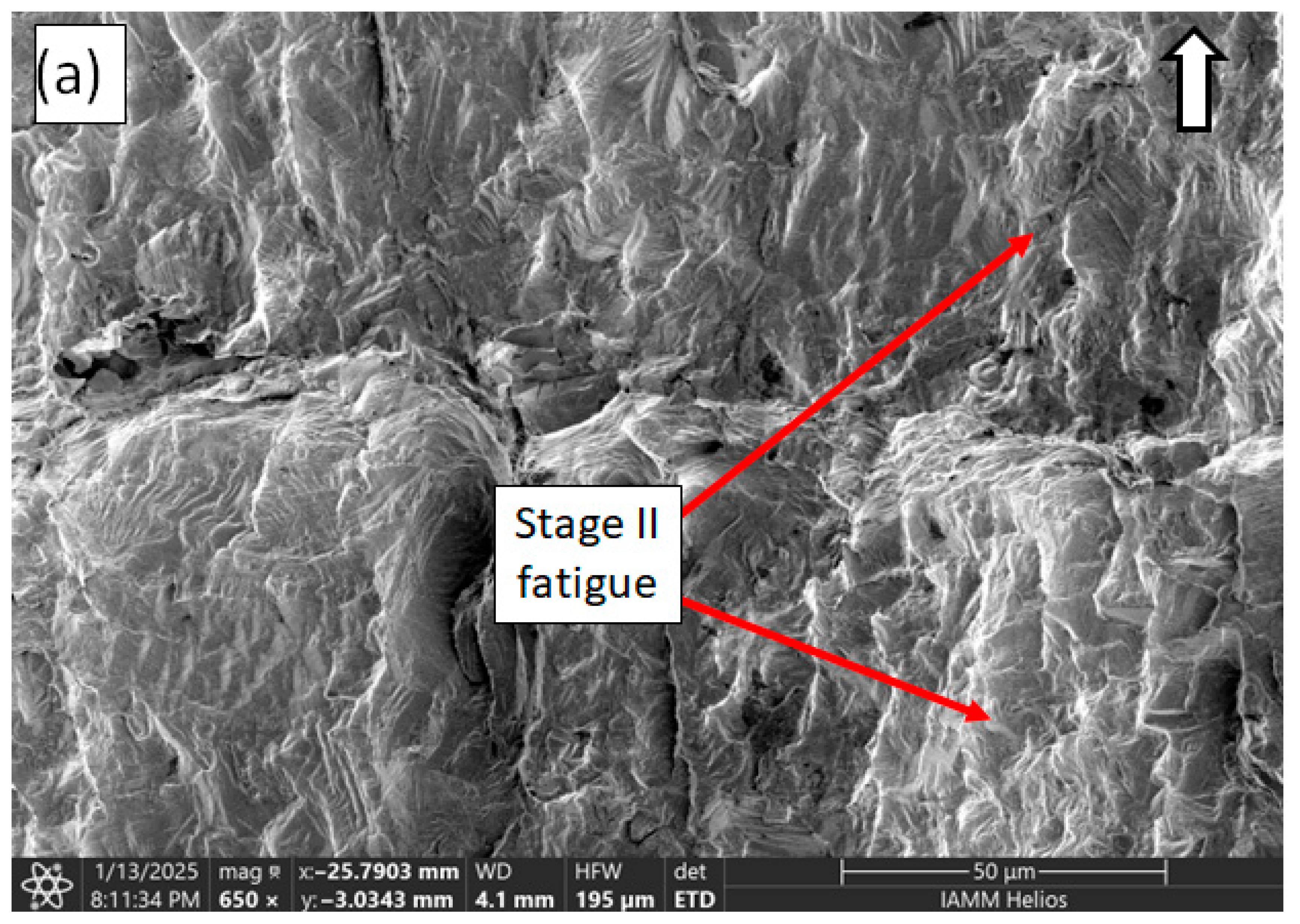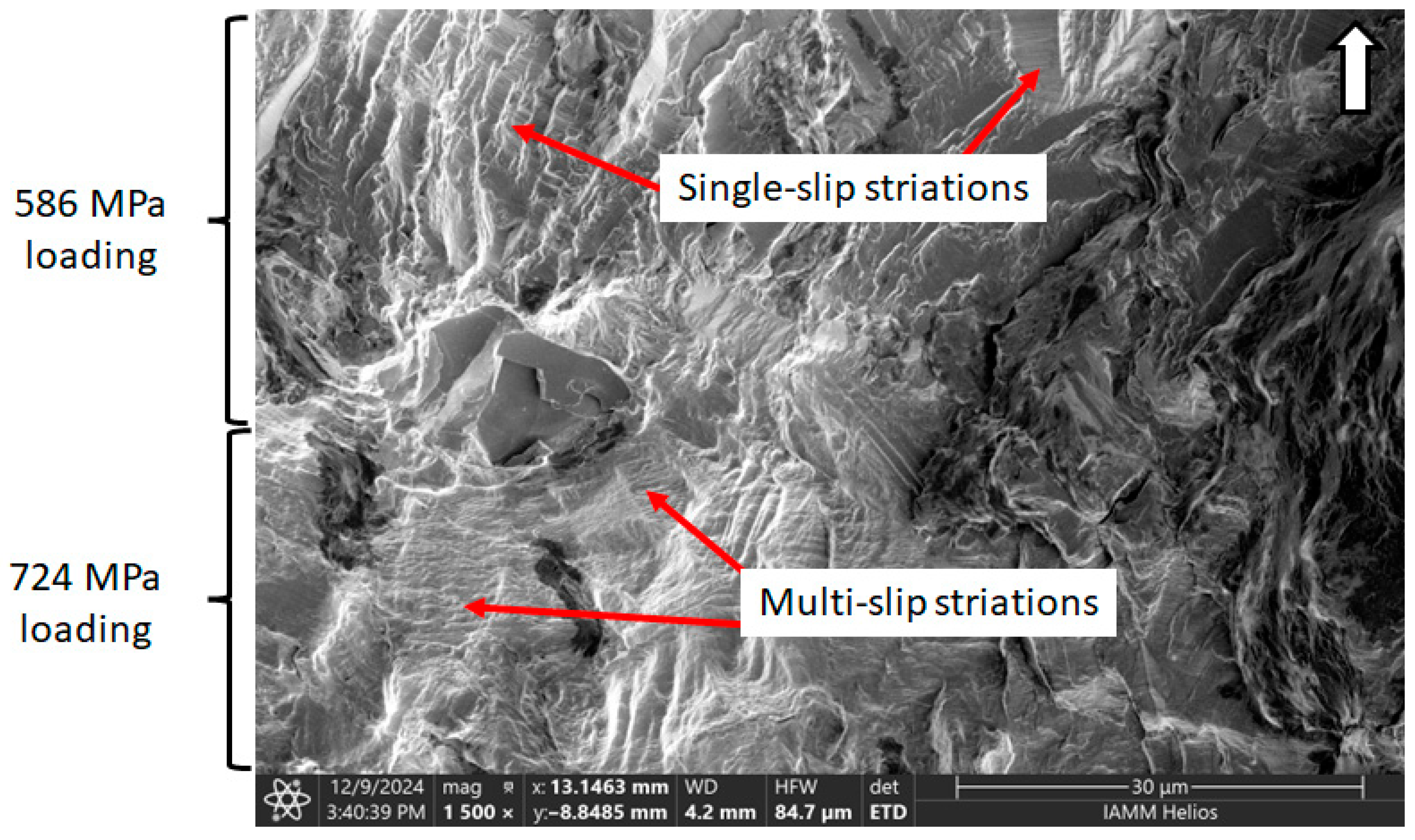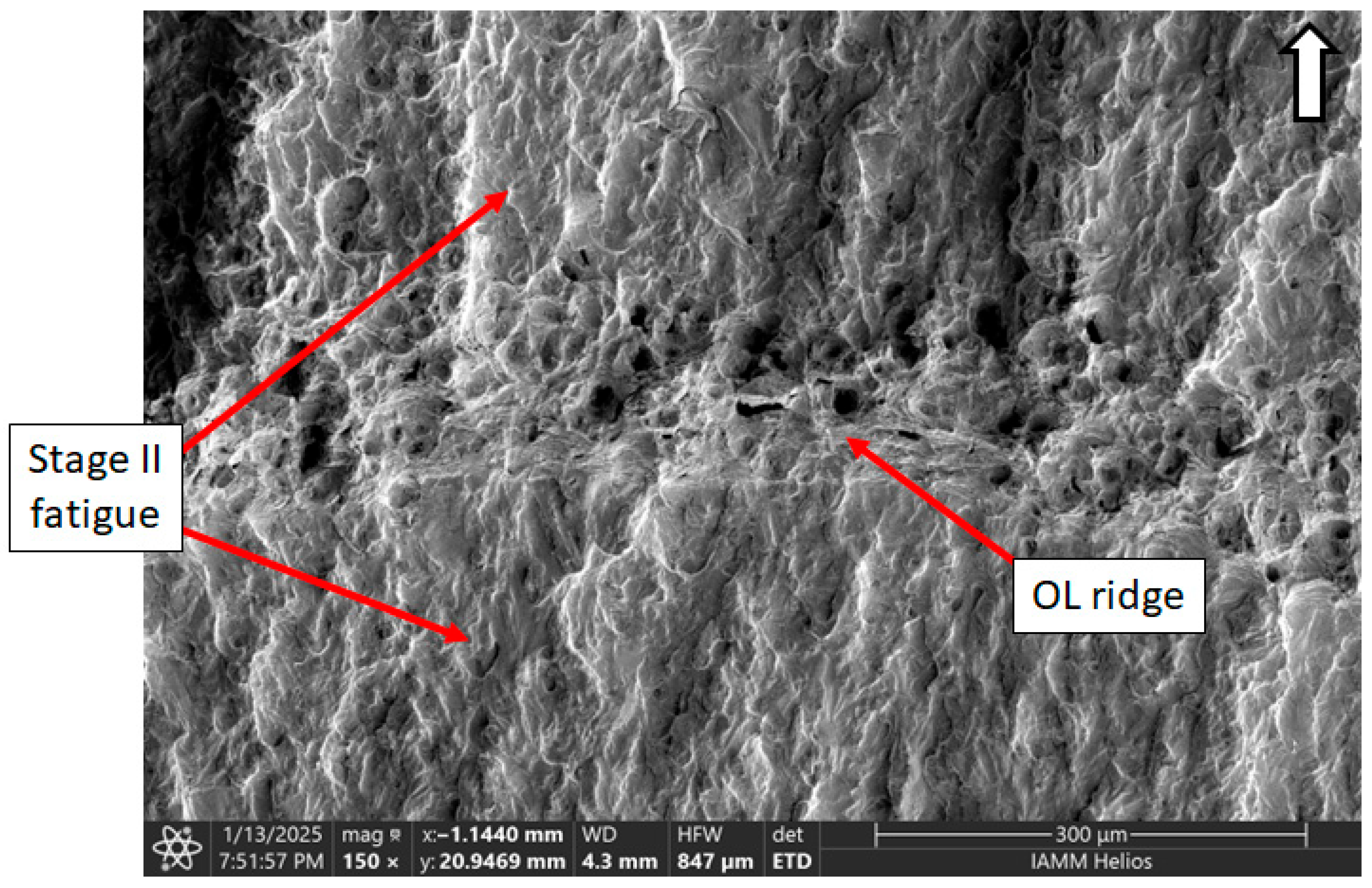 Areas on the fracture surface corresponding to load level changes were noted for both low to high load (586 to 724 MPa) and high to low load (724 to 586 MPa) changes. Locating the first load level transition in the H-L and POL specimens is challenging, as is differentiating the damage caused by the three initial load cycles at 724 MPa versus that from the subsequent 586 MPa cycles. When examining the difference between crack initiation and the start of short crack growth in the constant amplitude specimens, no general differences in texture were observed. This challenge also applies to identifying load level transitions elsewhere in the region of stage I fatigue. Transitions in load level are much easier to observe once the fatigue crack is propagating in stage II when transitions are distinguished by a change in striation spacing [47,48]. An example is provided (Figure 11) for a low to high load change in a block loading specimen.