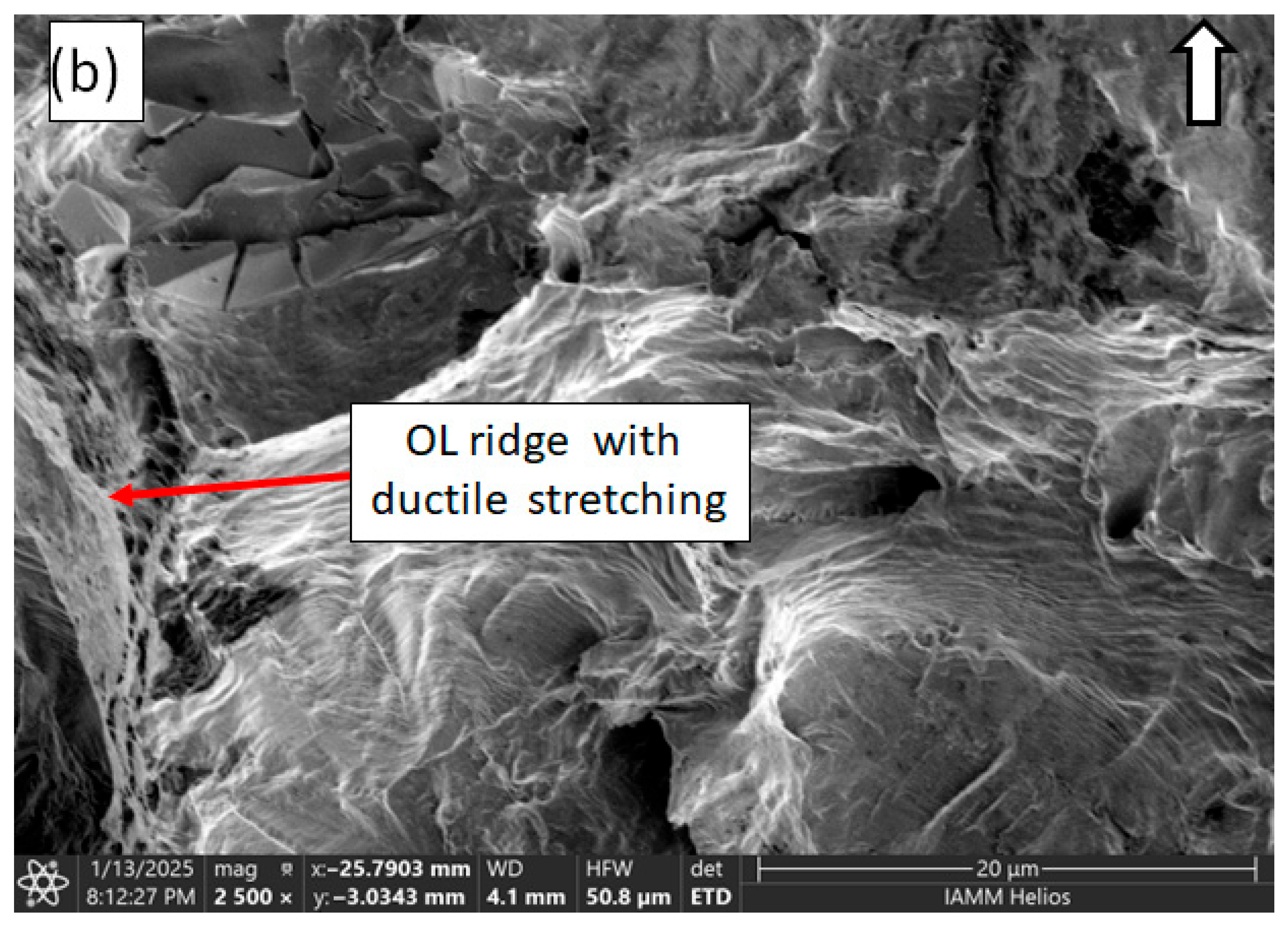 Due to the nature of stage I fatigue that typically occurred at a lower driving force (e.g., ΔK) than stage II fatigue, transitions from multi-slip to single-slip fatigue that are consistent across the crack front can be interpreted as changes from high to low loading (Figure 12). Several instances of HL to BL (724 to 586 MPa) load level changes were observed. The block loading specimen (B-2) exhibited the formation of a distinct ridge at the transition from the low 586 MPa load to the higher 724 MPa load (Figure 13). The texture in the area immediately after the load was similar to that observed in the ductile/fast fracture region, showing regions of ductile pitting. Several other fracture surfaces exhibited texture changes due to the single-cycle 724 MPa tensile Ols during the POL testing. Explicit differences at load changes were identified at crack lengths ranging from 680 to 1800 µm (Figure 14). The texture created during the OL itself demonstrated plastic stretching, possibly indicative of crack tip single-cycle crack extension or blunting, with longer regions exhibiting ductile pitting (Figure 15). Notably, this texture of plastic deformation was also observed when the crack length was short and growing in the stage I/single-slip regime (Figure 16).