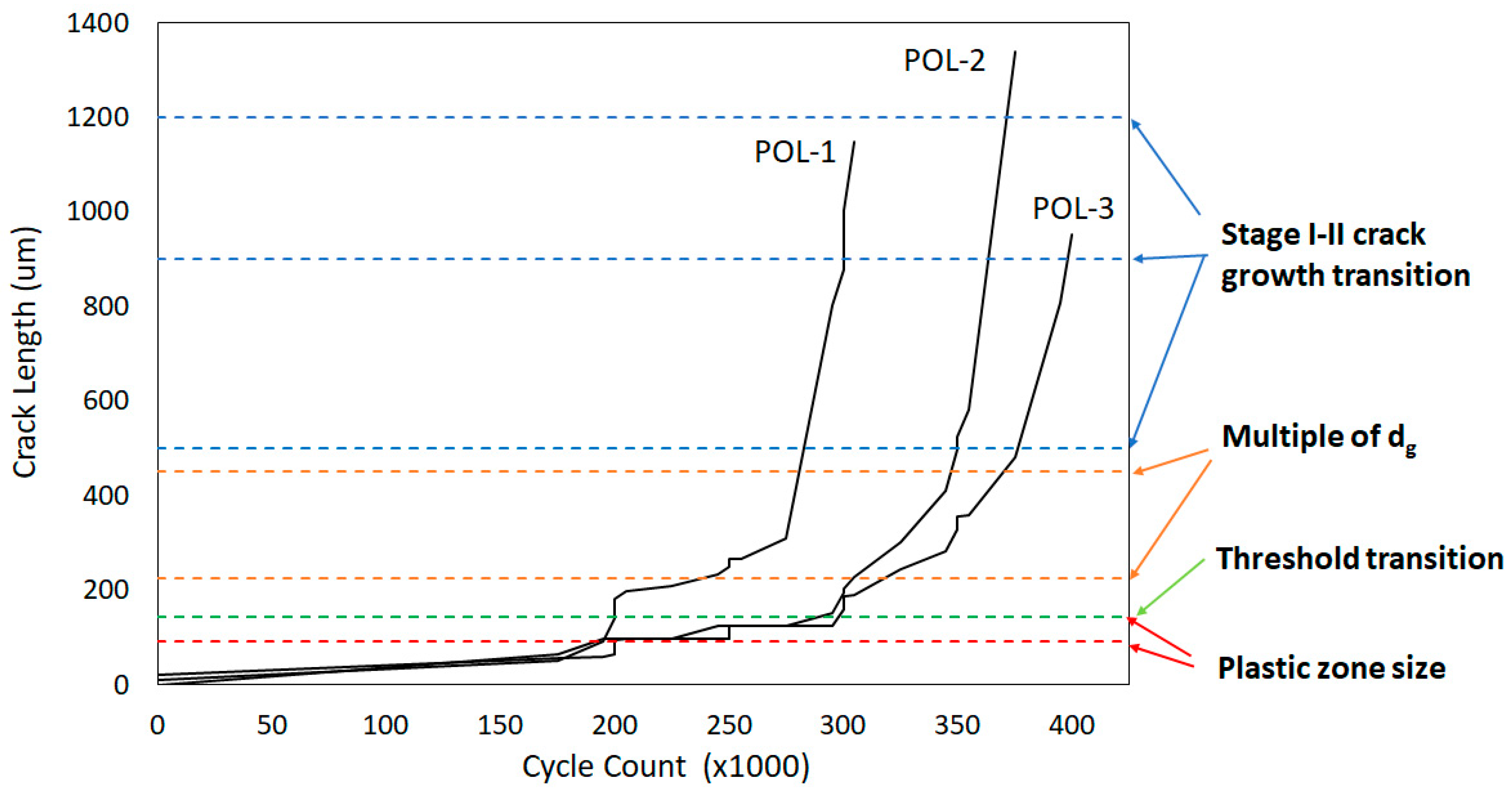 A plot of crack length data for the POL specimens, as compared with the short crack definitions, is provided in Figure 17. This plot shows that for the POL group, the majority of the fatigue life and crack growth occurred where at least one definition of a short crack, based on stage I vs. stage II crack growth, was applicable. Though the rest of the short fatigue crack definitions are applicable for smaller fractions of the total fatigue life than the slip-based transitions, they remain valid for at least 50% of the total life. This finding is consistent with other high cycle fatigue data, where crack initiation and short crack growth regimes constitute the majority of fatigue life [22]. Additionally, most of the applied OL cycles occurred at crack lengths where many of the smaller short crack definitions (such as those based on microstructure size or threshold behavior transition) are applicable. Due to the large portion of fatigue life spent in the short crack regime, we can assume that any of the load interaction effects present in the block and POL sample groups affected damage in the short fatigue crack growth regime. Some observations on the crack growth behavior with respect to the short crack definitions is that post-OL crack arrest is seen in cracks as long as 330 µm, within the short crack range based on characterizing microstructure dimensions, and that pre-OL crack arrest was not observed at crack lengths longer than 130 µm, just before the plastic zone/grain size for 586 MPa loads and the threshold behavior transition point.