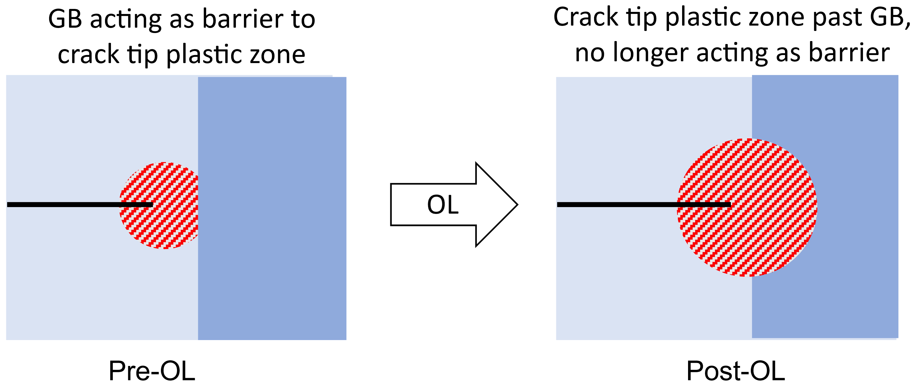 Microstructural barriers, such as grain boundaries (GBs), play a significant role in short crack growth rate variability [57] as well as fatigue endurance limit behavior [58,59]. Damage propagation, including at the physical crack tip as well as in regions of cyclic plasticity ahead of the crack tip, can be arrested or slowed by a grain boundary or other barriers if the applied loading and driving force are not sufficiently high to advance the crack tip through the barrier, resulting in variable and slowed short crack propagation under constant, low amplitude fatigue. Acceleration can occur across a grain boundary if a high-amplitude load cycle generates a driving force sufficient to advance the crack tip or the damage process/plastic zone past the barrier (Figure 19). This damage-accelerating behavior of VAF and OLs at microstructural barriers has been investigated using modeling techniques [19,54] and observed in experimental testing [27]. This damage acceleration is significant in cases where lower amplitude fatigue loads are below the material endurance limit, and barriers would arrest crack growth without the OL growing the crack or damage zone past the grain boundary.