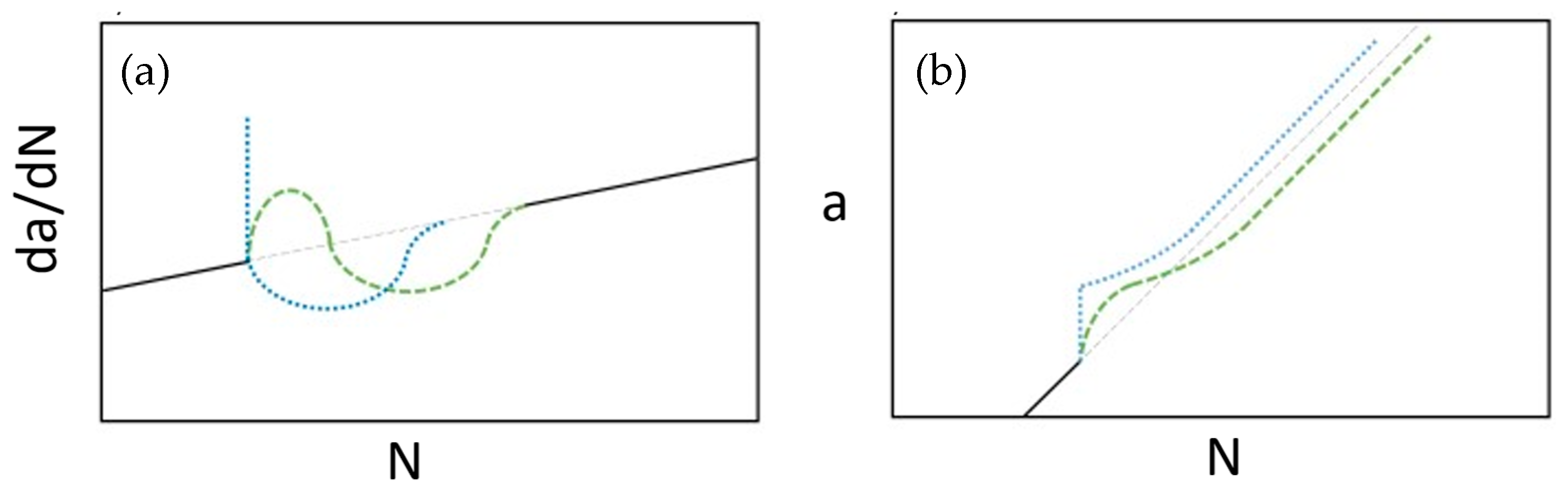 Several measures have been used to quantify the effects of an individual OL or load level change on fatigue damage. The most basic and widely used method for both experimental analysis and modeling is an acceleration or retardation factor (AF). The AF is a ratio of crack growth rates before and after an OL or a change in load level (Equation (2)). An AF >1 indicates acceleration, while an AF < 1 indicates deceleration. This particular measure is applied in methods such as the Wheeler model [14] and in block loading [54],