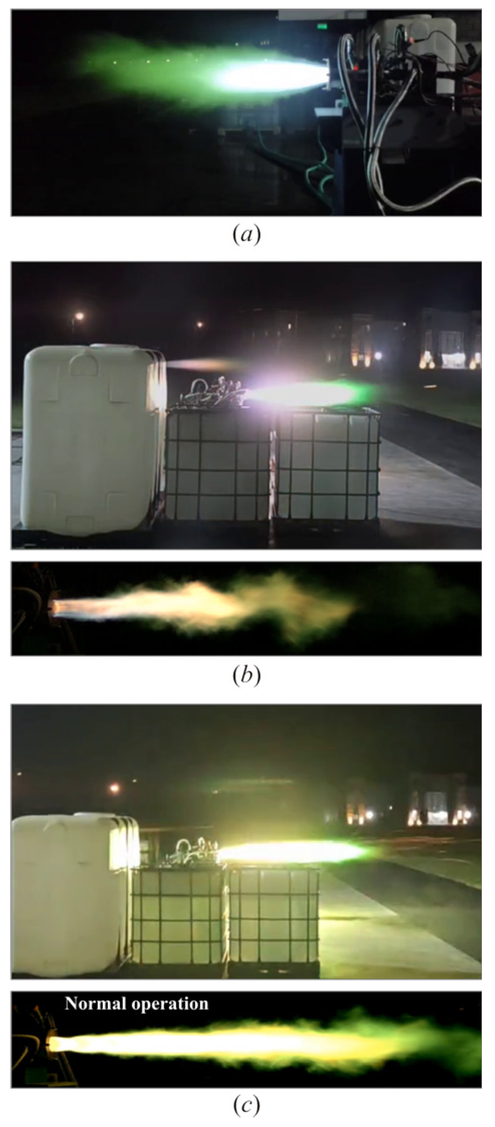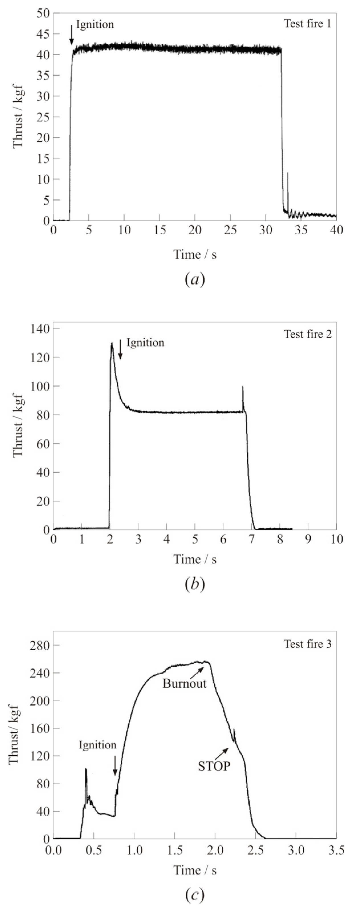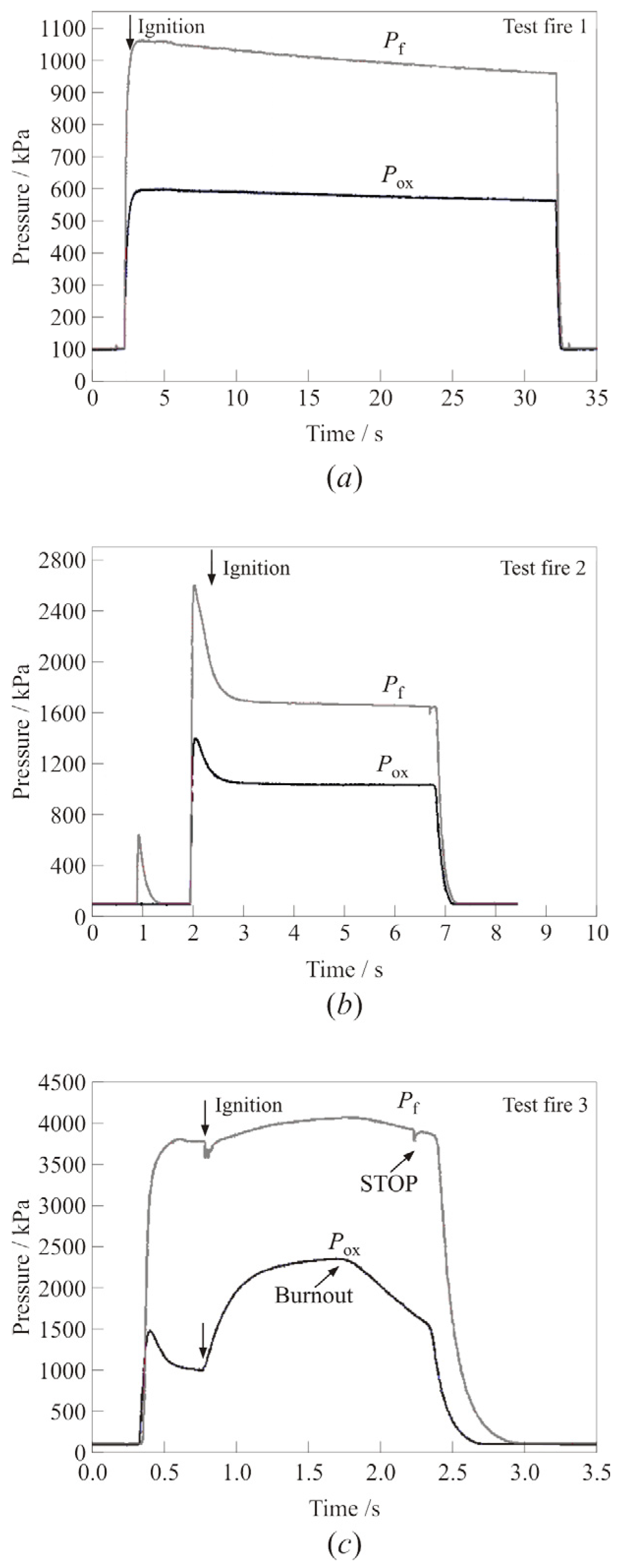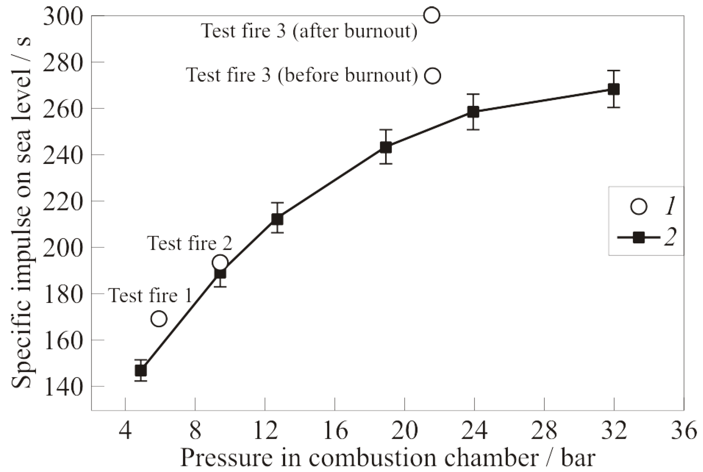 | Test Fire | t s | G kg/s | Ф | Pox kPa | Pf kPa | PCC kPa | f kHz | n | D m/s | F N | Isp s | % |