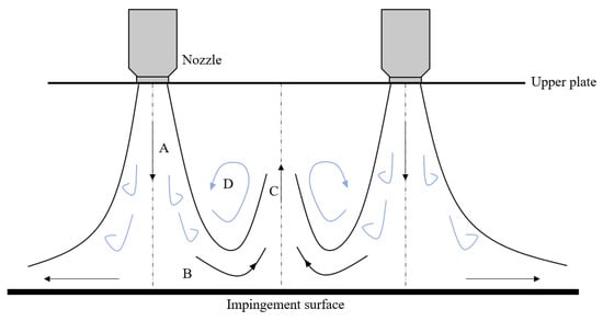 Schematic of the dual impinging jet flow field structure: (A) jet, (B) wall jet, (C) fountain flow, and (D) entrainment vortex.