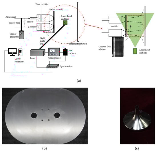 The contraction nozzle is shown in Figure 2c. The outlet stabilizing section has an inner diameter of 25 mm and a length of 20 mm, and the spacing between the two nozzles is s = 240 mm. An aluminum alloy plate of size 1000 mm × 1000 mm × 20 mm was used in the experiment as the jet impingement plate, which was fixed perpendicular to the jet well at a certain distance from the nozzle. An additional circular plate was added at the nozzle plane Figure 2b, which was formed by intersecting two circles of 24 times the diameter of the nozzle.