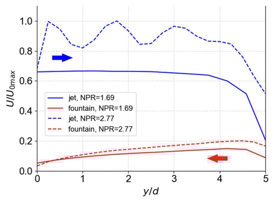 Velocity profiles at the cross-stream location y = 4d under different NPRs.