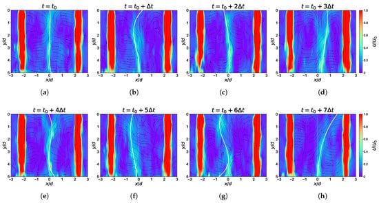 As shown in Figure 6, the flow-field structures at eight consecutive time instants (with a time interval of ) are presented. It can be observed that, on this time scale, the macroscopic structure of the primary jet remains highly stable, whereas the unsteady motion mainly originates from small-scale vortical structures developing within the jet shear layers. These structures are triggered by the strong velocity gradients between the high-speed jet core and the surrounding fluid, which are well known to induce Kelvin–Helmholtz instability in free and impinging jet flows [7]. Compared with the primary jet, the fountain shows more pronounced lateral oscillation, and therefore constitutes the most prominent dynamic feature of the present flow field.