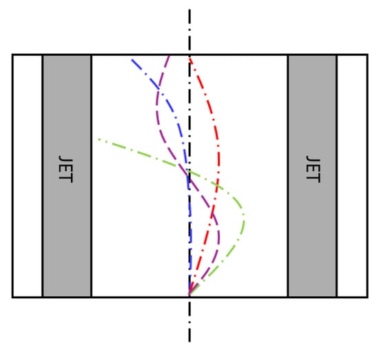 Deflection modes of the fountain centerline: the blue line indicates the stable deflection mode, while the red, purple, and green lines represent deflection under unstable conditions.