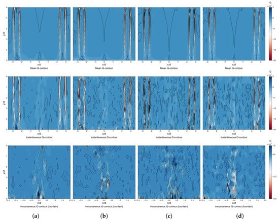 As shown in Figure 8a, the vortical structures within the flow field are predominantly shear-layer vortices. These vortices are primarily concentrated in the shear layers of the dual jets, and their intensity gradually diminishes with jet development. The instantaneous Q-criterion distribution clearly reveals that the shear-layer vortices in the upstream region maintain coherent shapes, indicating that significant momentum dissipation has not yet occurred. Further downstream, these primary vortices break down into smaller, secondary vortices, whose arrangement becomes increasingly disordered. In the vicinity of the impingement wall, the shear-layer vortices undergo further breakdown and eventually dissipate. In contrast, the jet core and the impingement region are dominated by rotational vortices, whose intensity is approximately 15% of that of the shear-layer vortices.
