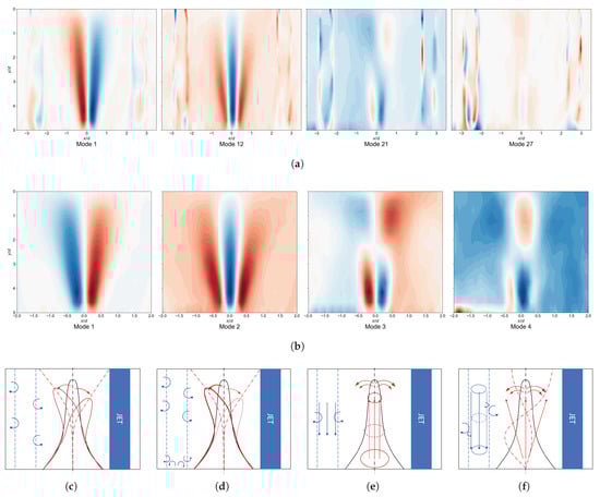 Figure 9 presents the extracted POD modes of the dual impinging jet flow field. It displays the modes for the entire field, the modes isolated for the fountain region, and the corresponding dynamic mechanisms associated with these modes. A clear structural correspondence is observed between the global modes and the localized fountain modes.