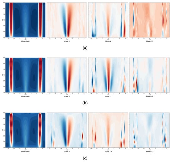 POD modes under different NPRs, (a) NPR = 1.69, (b) NPR = 2.13, (c) NPR = 2.77.