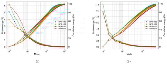 When applying the POD method for data dimensionality reduction, the modes are ranked based on their contribution to the total energy of the flow field. Figure 11a displays the energy fraction of each mode for the entire field. Overall, the cumulative energy of the first 50 modes shows an increasing trend with rising NPR. Specifically, at NPR = 1.52, the first 50 modes account for 57.0% of the total energy, while this value increases to 60.5% at NPR = 2.77. The low-order POD modes typically correspond to the coherent structures in the flow. A higher energy fraction in these modes indicates more prominent and organized large-scale dynamics. Under supersonic conditions, the first 50 modes primarily capture the characteristic structures of the jet core, with only a few modes representing the fountain dynamics. Compared to the subsonic regime, the higher NPR imparts more momentum to the flow, which suppresses vortex shedding and reduces the level of turbulent fluctuations. Concurrently, the presence of shock waves further enhances the organization of the flow field. Notably, at NPR = 1.89—a transonic condition—the cumulative energy of the first 50 modes shows an anomalously low value of 53.9%. This phenomenon can be attributed to the unique nature of the flow at this stage: the shock structures are in the process of formation, and the overall flow is in a highly unsteady transitional state, which consequently weakens the ability of the POD method to extract distinct dominant structures.