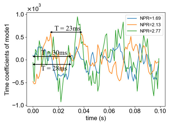 Figure 12 presents the temporal coefficients of the first POD mode for three different NPRs. Only the first mode is considered here because it has the highest energy content among all POD modes (as shown in the preceding energy-contribution analysis) and therefore represents the dominant coherent dynamics of the flow. Analysis indicates that at NPR = 1.69, the oscillation period is approximately 30 ms. As the NPR increases, the oscillation period shows a shortening trend, while the amplitude increases significantly. At NPR = 2.77, the maximum amplitude reaches 943.11, which is three times that observed at NPR = 1.69. Regarding the phase relationship, the temporal curves for NPR = 2.13 and NPR = 2.77 are essentially in phase, whereas the curve for NPR = 2.13 shows a phase lag of approximately one-quarter of a cycle. This phase lag is likely associated with the transonic regime at NPR = 2.13, where the jet undergoes a transition in compressibility and shear-layer/shock interactions become intermittent. Such unsteady structural changes can modulate the fountain upwash and lead to a delayed response relative to the more fully established oscillation observed at higher NPR.