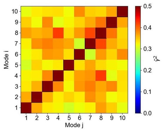 According to the preceding analysis, which established that the low-order modes of the fountain effectively represent its dominant flow structures, this section employs the first 10 modes to reconstruct the fountain flow field. Figure 13 presents the magnitude-squared coherence analysis among these top 10 energy-containing modes within the 0–300 Hz frequency range. As shown, high coherence values (approximately 0.4) are observed between Mode 1 and Mode 2, as well as between Mode 3 and Mode 4, which aligns with their previously described conjugate modal structures. Modes 5 and 6 present low coherence with Mode 1 but significant coherence with Mode 2, suggesting their dynamics are related to variations in fountain intensity. Modes 7 and 8 demonstrate strong mutual coherence, indicating that they form a dynamically related modal pair at a higher order. Mode 7 exhibits a clear anti-symmetric spatial structure, while Mode 8 displays a mixed modal structure, characterized by an approximately symmetric distribution in the lower region and an asymmetric structure in the upper region. Following the same hierarchical progression, Modes 9 and 10 are identified as further successive higher-order extensions of Modes 7 and 8, respectively.