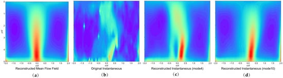 Reconstruction of the fountain flow field using low-order modes. (a) Reconstructed time-averaged flow field, (b) Original flow field, (c) Flow field reconstructed using the first four modes, (d) Flow field reconstructed using the first ten modes.