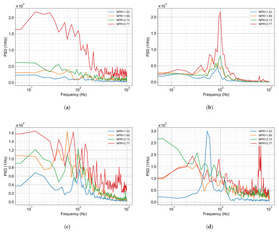 PSD results for the eigenmodes at different NPRs, (a) for the superposition of all modes, (b) for the results of theleft-right reversed mode of the fountain flow, (c) for the results of the left-right symmetric mode of the fountain flow, and (d) forthe modes in the main flow stream of the jet.