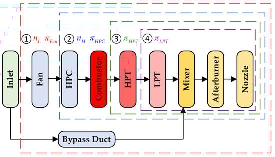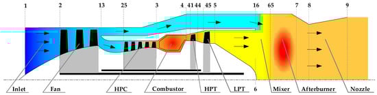 This paper focuses on a twin-spool mixed-flow turbofan engine, which consists of the following components: inlet, fan, high-pressure compressor (HPC), bypass duct, combustor, high-pressure turbine (HPT), low-pressure turbine (LPT), mixer, afterburner, and nozzle. Its overall configuration and cross-sectional layout are shown in Figure 1. Herein, the numbers in the figure denote the serial numbers of each engine section.