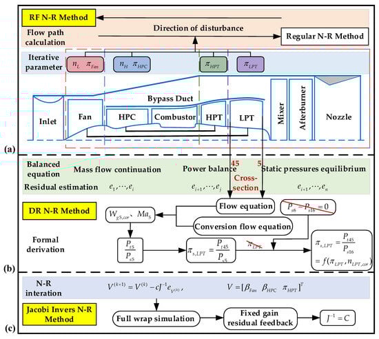 Early iterative methods, also known as equilibrium techniques, primarily encompass parameter cycling and balanced cycling methods. Both approaches are distinguished by their simplicity and ease of implementation. However, as the configuration complexity of aero-engines continues to rise, these methods have proven insufficient to meet real-time requirements. In response to this problem, more advanced algorithms such as the N + 1 point residual method, the Newton-Raphson (N-R) method, and Broyden’s method have been successively proposed in academia [18]. Among these, the N-R method has become one of the most extensively used techniques in aero-engine performance simulation due to its high computational accuracy and excellent convergence characteristics [19,20]. It should be noted, though, that each iteration requires the incremental perturbation of initial guess variables and flow path computation to construct the Jacobian matrix, which must then be inverted to update the initial guess variables, resulting in low computational efficiency. Consequently, numerous domestic and international researchers have pursued the following series of improvements to the N-R method.
