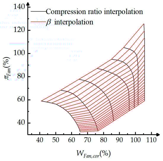 The elements of the inverse of the Jacobian matrix are derived from corrections to the initial guess variables during the iteration process. However, during the characteristic curve interpolation process, there may be instances where the characteristic curve exhibits non-monotonic behavior in the upper left quadrant of the characteristic map of the compression components’ air flow rates and pressure ratio [36]. In such cases, the compressor operating points fall near the unstable boundary, which can result in the calculation of different air flow rates at the same pressure ratio through characteristic map interpolation. This non-monotonicity is clearly detrimental to the iterative solution, affecting the model’s computational accuracy and stability [37].