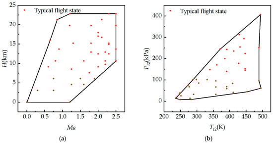 As shown in Figure 6, forty typical flight states within the full flight envelope are selected to analyze the inverse elements of the Jacobian matrix. The selected typical flight states can fully cover the flight envelope formed by altitude () and Mach number (Ma) (Figure 6a) and can also adequately represent the flight envelope formed by the total temperature and total pressure in the engine inlet section (Figure 6b).The specific altitudes and Mach numbers of forty typical flight states are shown in Table 3.