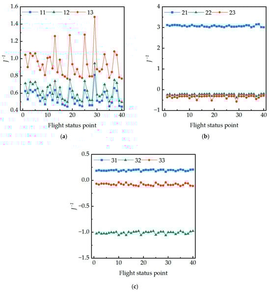 Based on the forty flight states listed in Table 3, for each flight condition, multiple operating points where the LP rotor shaft speed ranges from 70% to 100% were considered. A quasi-steady-state point was selected every 5%, resulting in a total of seven state points. For each state point, ten different engine working states were selected by adjusting the steady-state fuel flow rate up and down by ±40%. This provides sufficient dynamic excitation for the inverse Jacobian matrix elements. The total average value of the elements of the inverse Jacobian matrix from all seven state points, obtained by averaging the values across seventy states, represents the result of the elements of the inverse Jacobian matrix for that flight state point. Applying the aforementioned method, the Jacobian inverse matrix elements for forty flight states were obtained. Figure 7 shows the variation in the average values of the elements of the inverse Jacobian matrix across forty flight state points.