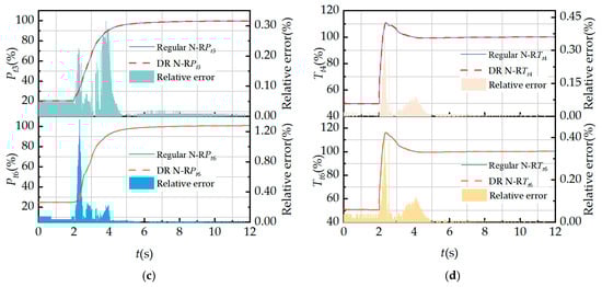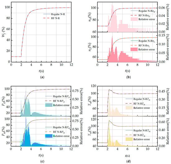 To further verify the feasibility of this method, small-step transient performance simulations of the engine are performed. As shown in Figure 11, a direct comparison is drawn between the small-step transient simulation results obtained via the regular N-R method and the RF N-R method. In detail, Figure 11a characterizes the fuel supply variation during the small-step transient process, while other subplots exhibit the dynamic responses of critical engine performance metrics. Notably, the MRE associated with the core engine gas path parameter calculations in the transient processes is limited to 1.6%, well within the acceptable range for engineering practice.
