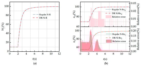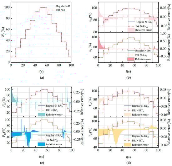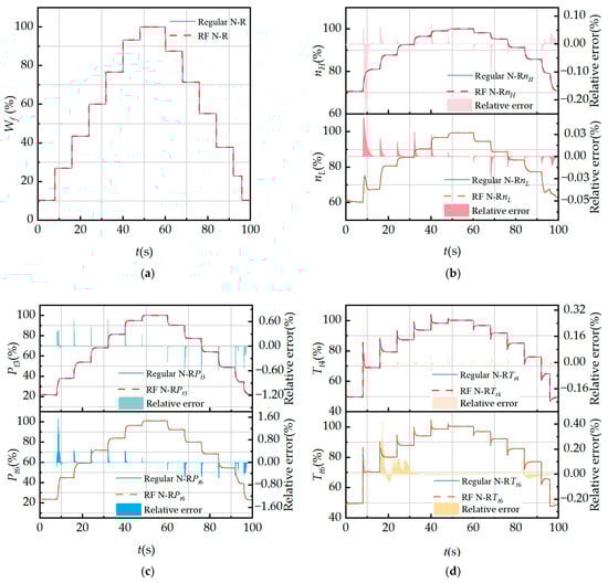 Figure 9 and Figure 10 present a comparison of the engine’s steady-state and regular transient performance simulation results using the regular N-R method and the RF N-R method. Among them, Figure 9a and Figure 10a, respectively, show the fuel changes during steady-state and regular transient acceleration processes, while the other figures depict changes in engine performance parameters.
