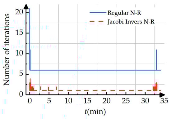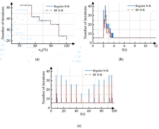 Comparison of regular N-R method and RF N-R method number of iterations: (a) steady-state simulation number of iterations; (b) regular transient simulation number of iterations; and (c) small-step transient simulation number of iterations.