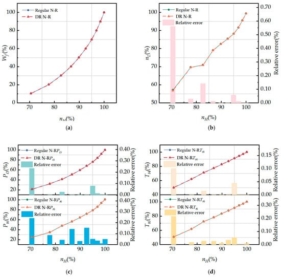 Comparison of regular N-R method and RF N-R method steady-state performance simulation: (a) fuel flow rate; (b) LP and HP rotor shaft speeds; (c) HPC and internal duct outlet total pressure; and (d) combustion and internal duct outlet total temperature.