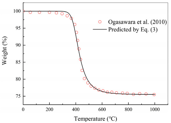 Based on the data provided by Ogasawara et al. [16], the comparison between the predicted thermogravimetric curve using Equation (3) and the experimental results was shown in Figure 1. The predicted thermal degradation process obtained using Equation (3) shows good agreement with experimental results. It is worth noting that all current pyrolysis kinetic parameters have been determined under conventional heating rates. Their applicability under lightning strike conditions remains to be verified.