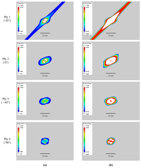 In-plane contour plots obtained from the top four layers of (a) temperature-based model and (b) pyrolysis-based model (step 2, 30 s).